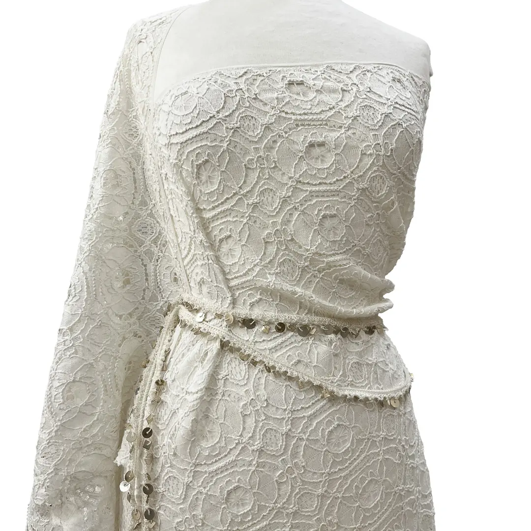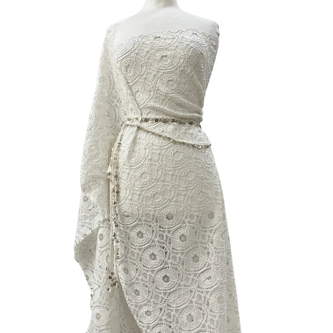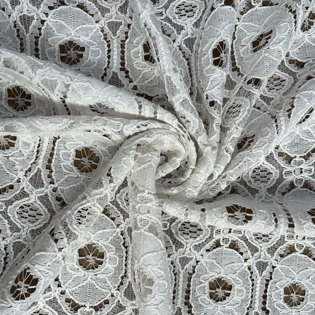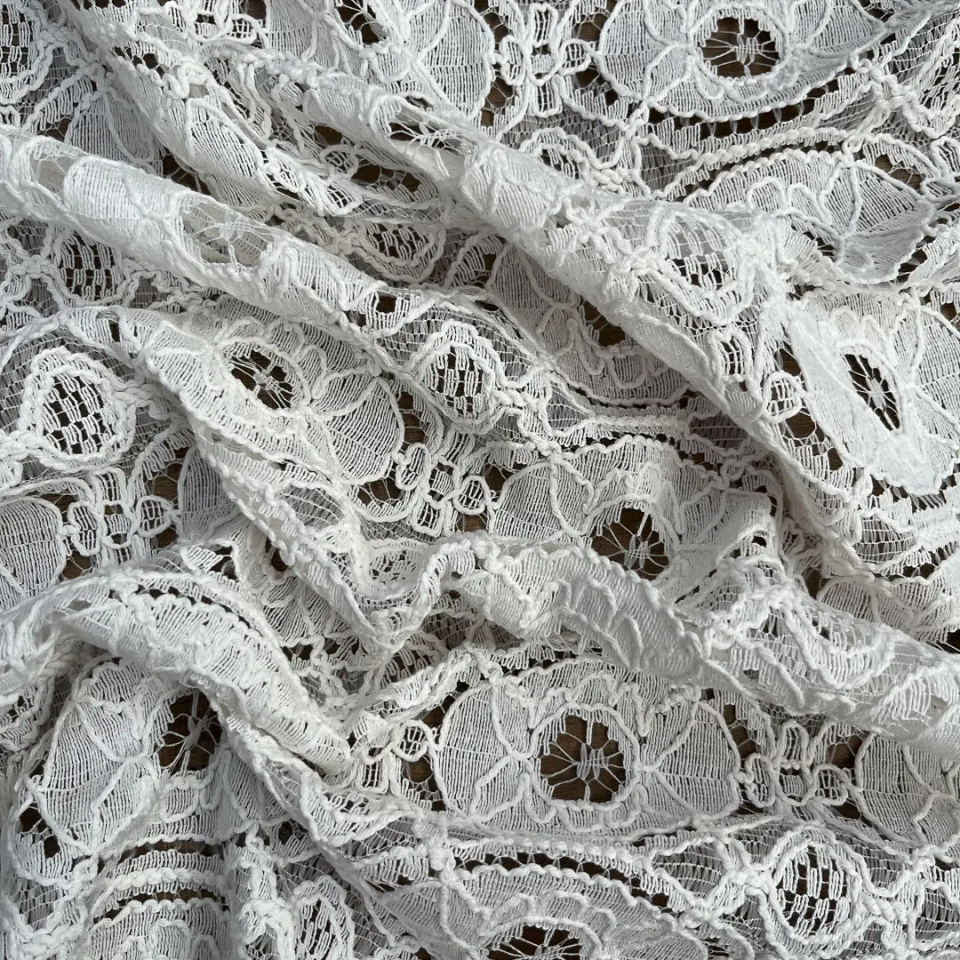 Stoffa in pizzo composta per l’80% da cotone naturale e per il 20% da poliestere, che rappresenta un’eccellente fusione di tradizione e modernità nel mondo dei tessuti decorativi, offrendo una texture delicata e traspirante ideale per creazioni sartoriali raffinate.