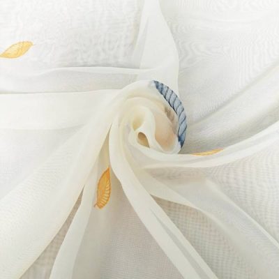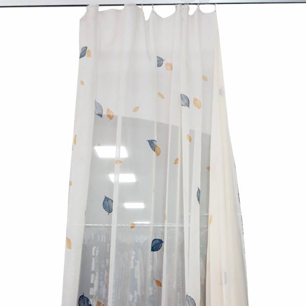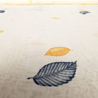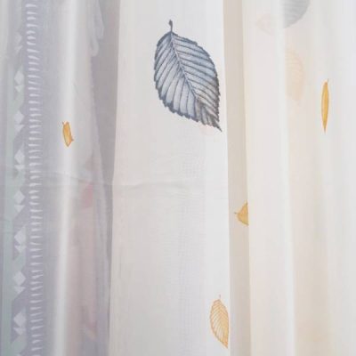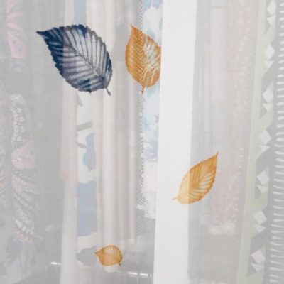 Tessuto per tendaggio, trasparente in color bianco “panna” con stampa di piccole foglie a tema autunnale, con colori che variano dal giallo “ocra” e blu scuro.