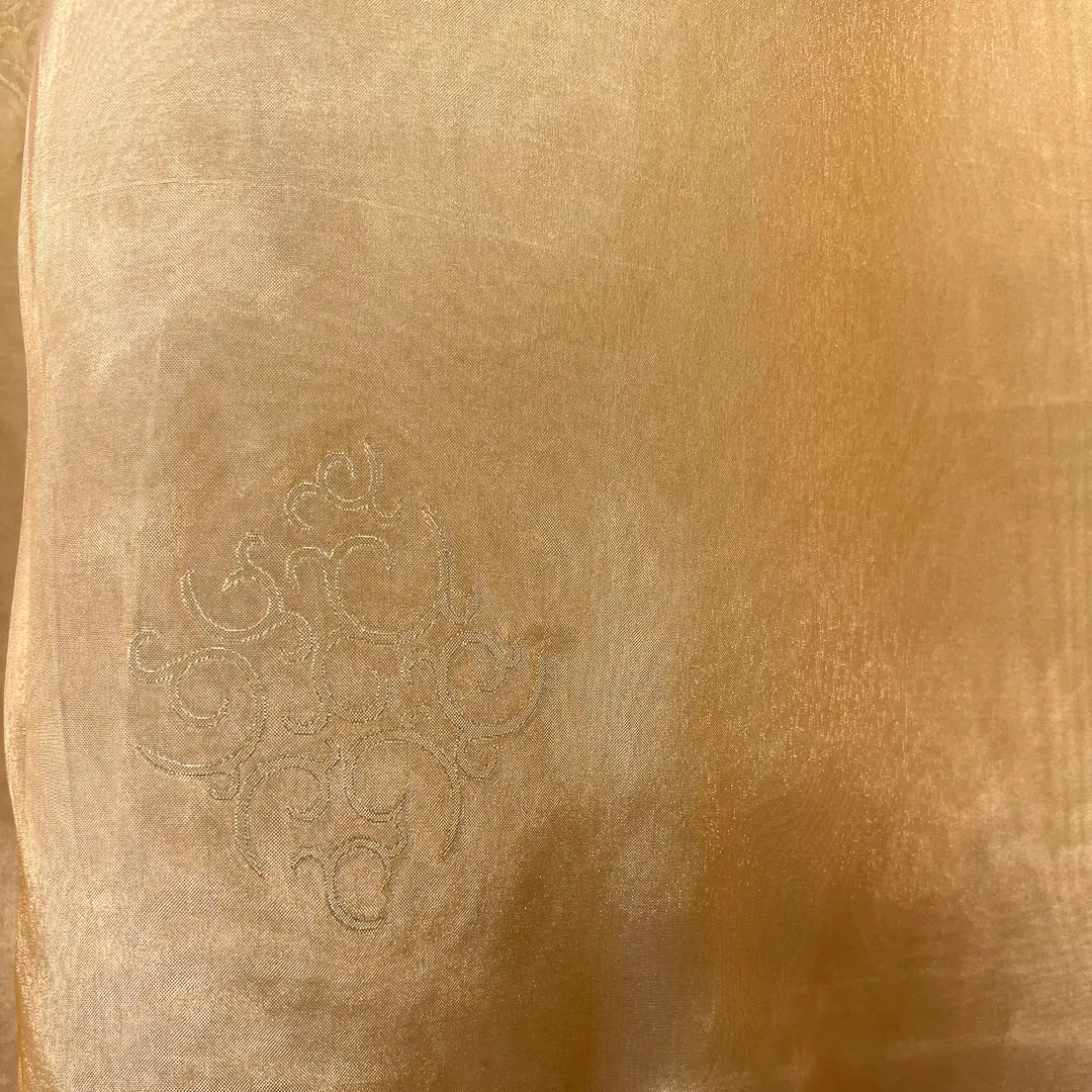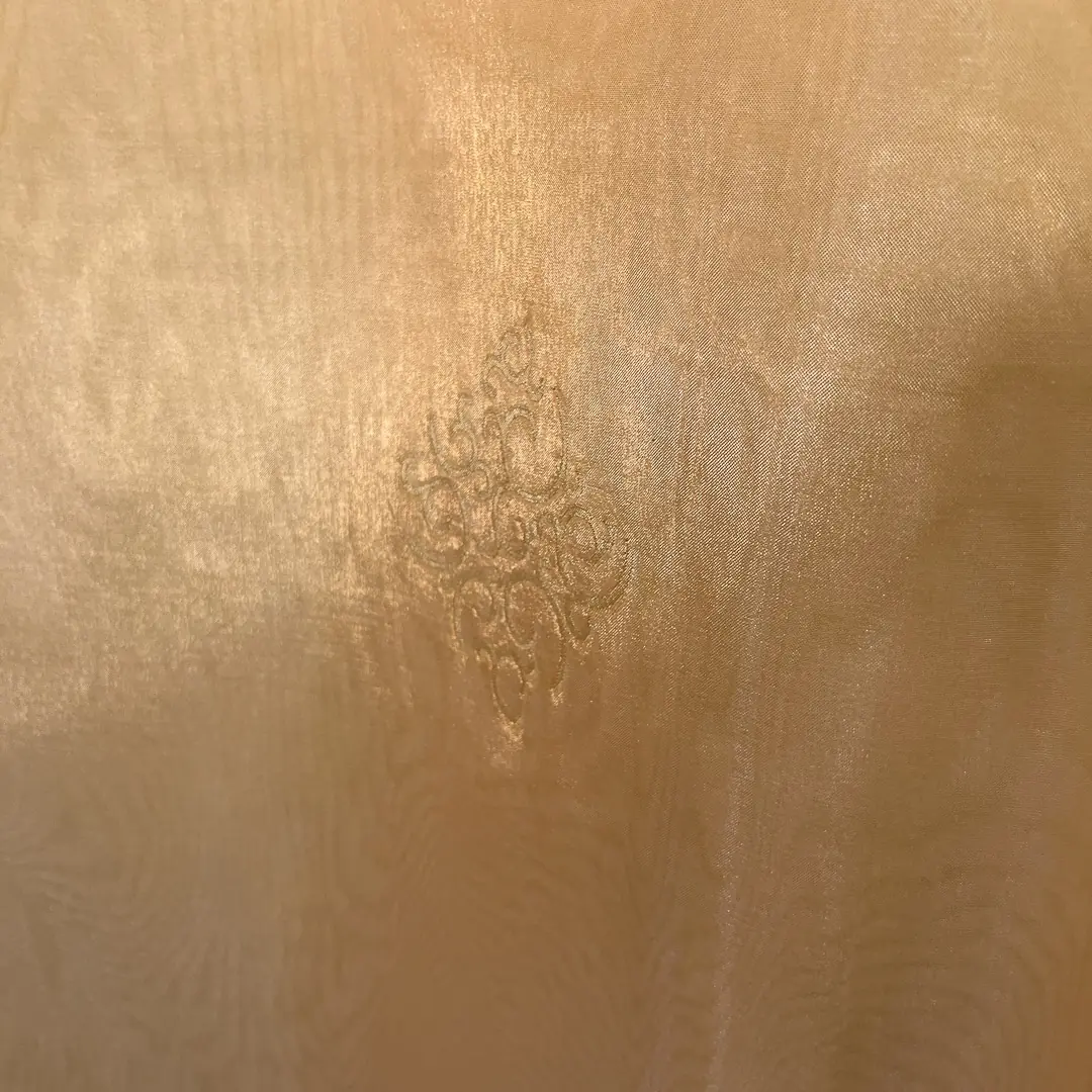 Il tendaggio è caratterizzato da un arancio dorato brillante che cambia intensità secondo la luce, con dettagli bronzo, crema e tocchi di rosa corallo che arricchiscono il tessuto e creano un effetto caldo, vivace e opulento; la palette cromatica si mantiene elegante e durevole anche dopo i lavaggi delicati.