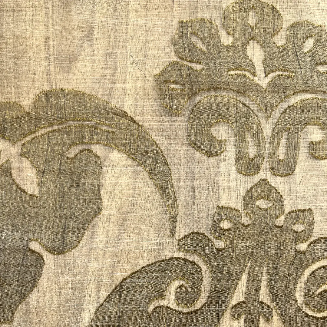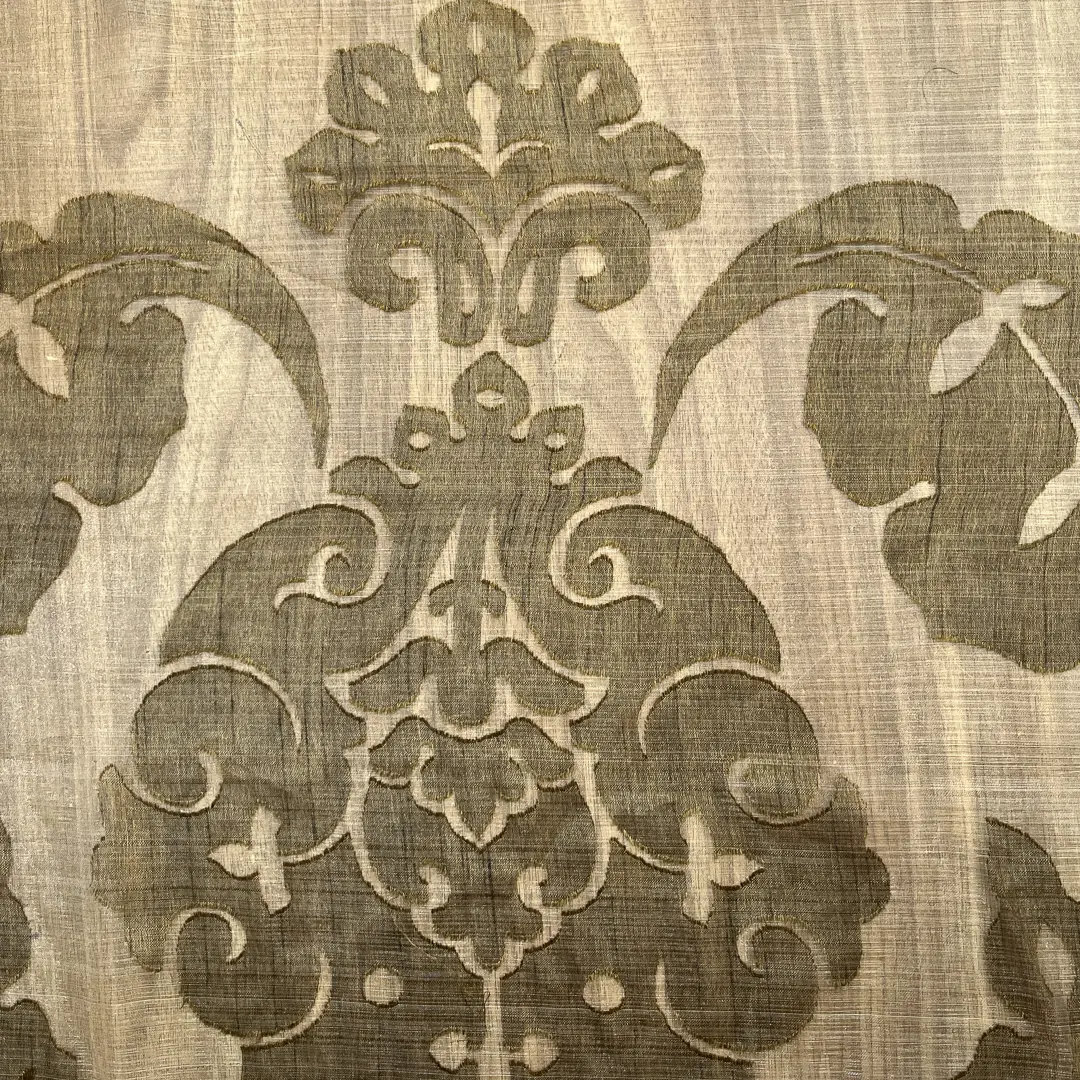 Stoffa in organza devoré con pattern damascato, adatto per tende che richiedono trasparenza e filtraggio della luce.