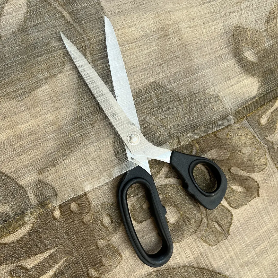 L’organza base è un tessuto leggero e trasparente, trattato con la tecnica devoré che rimuove selettivamente le fibre per creare aree semitrasparenti nei motivi, mentre le parti non trattate rimangono opache per un contrasto netto.