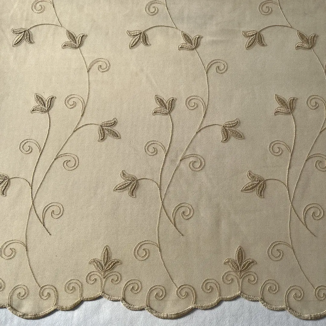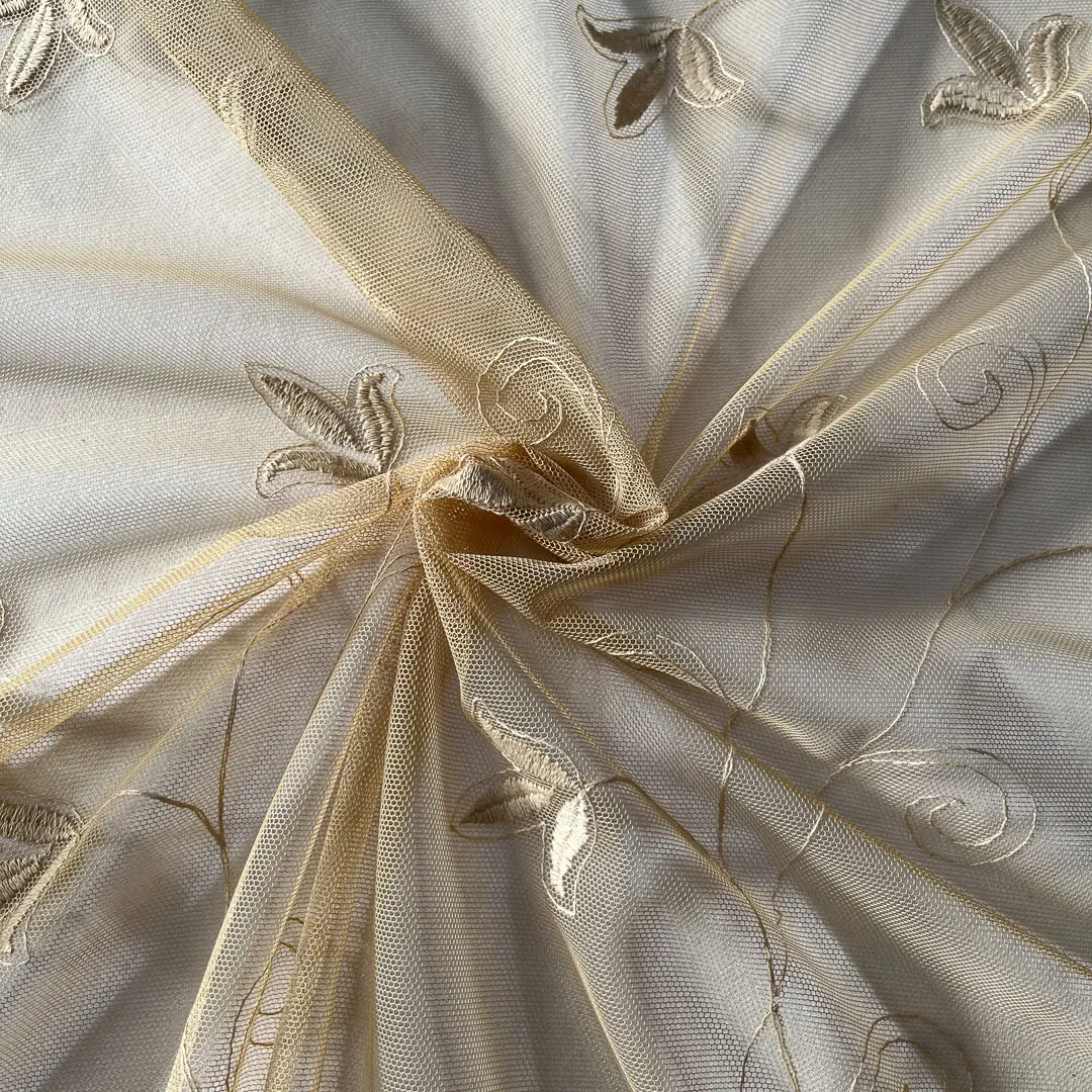 Tessuto per tende in tulle ricamato con foglie e steli stilizzati