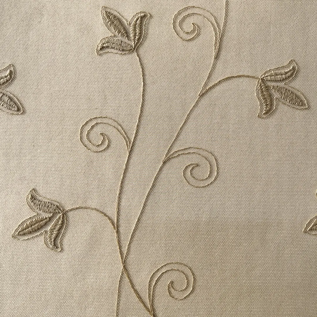 Questo tessuto per tende in tulle ricamato incanta grazie alla sua delicatezza e luminosità. La base trasparente, leggerissima e impalpabile, lascia filtrare la luce naturale donando all’ambiente un’atmosfera morbida e raffinata, che alleggerisce l’ambiente. Su questo vel in tulle color sabbia dorato si rincorrono sottili ricami floreali dalle linee sinuose e raffinate, eseguiti con cura in filato beige dorato tono su tono, che conferisce un prezioso gioco di chiaroscuro e riflessi dorati.