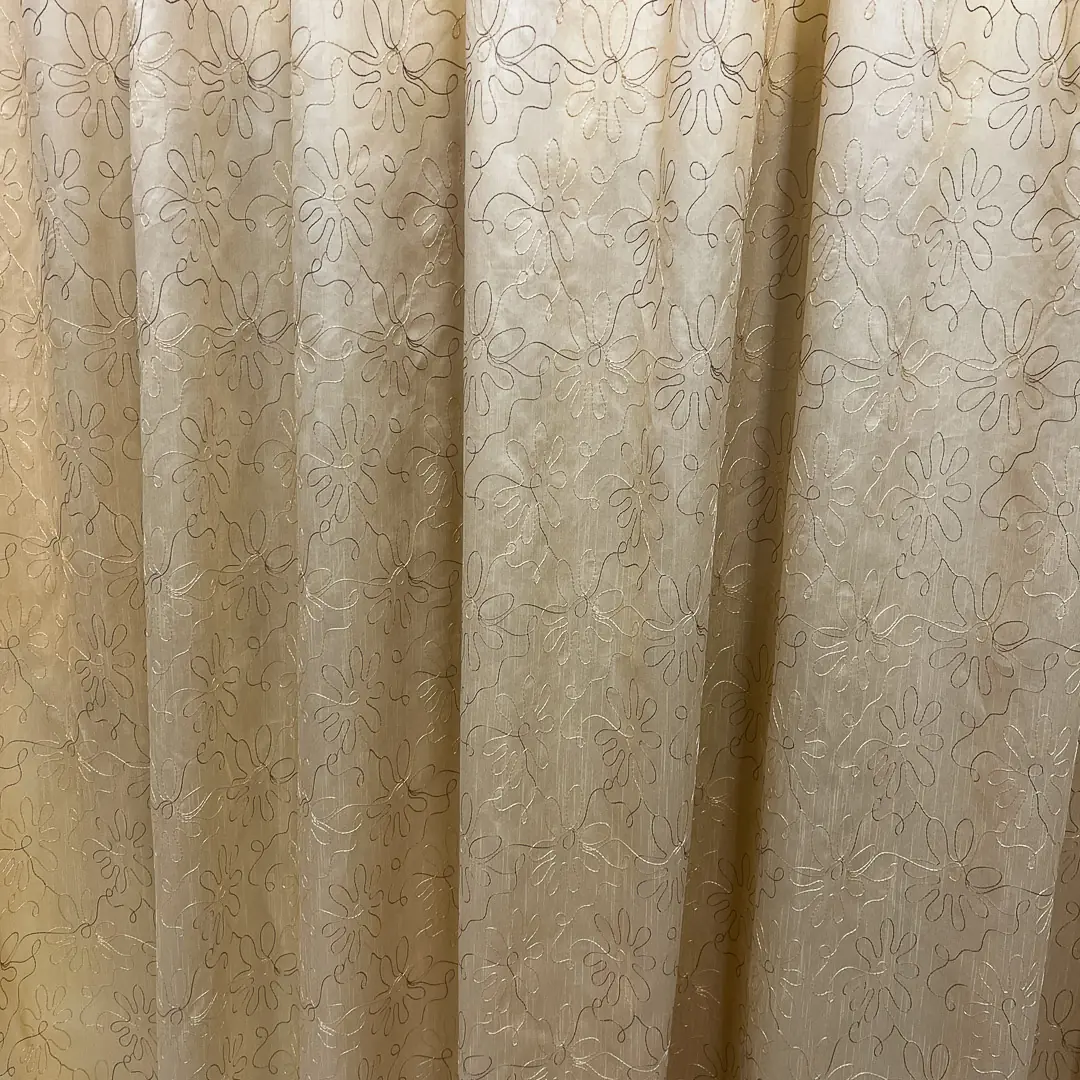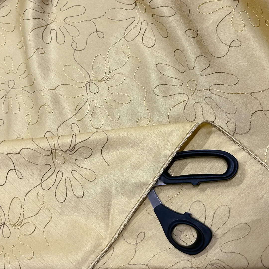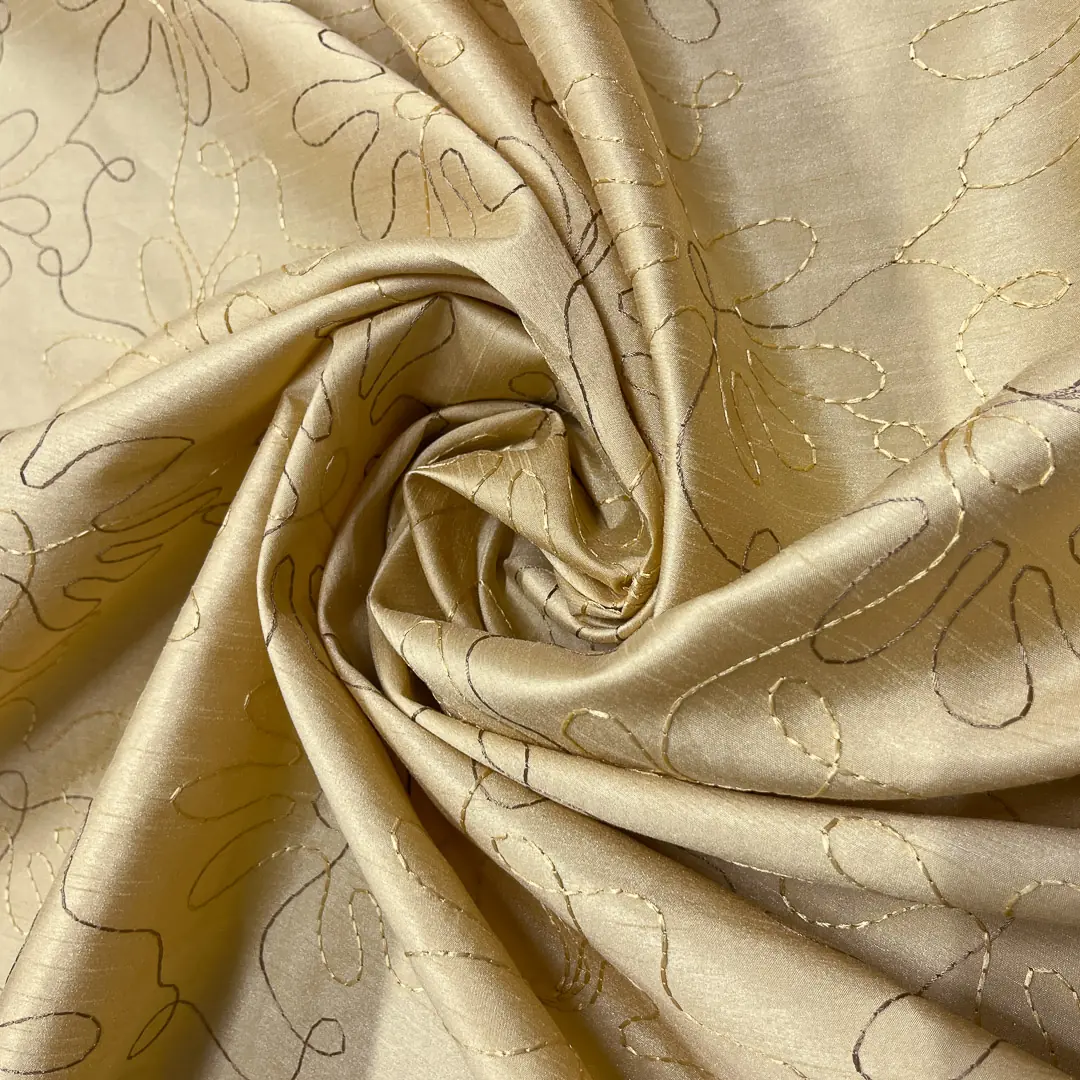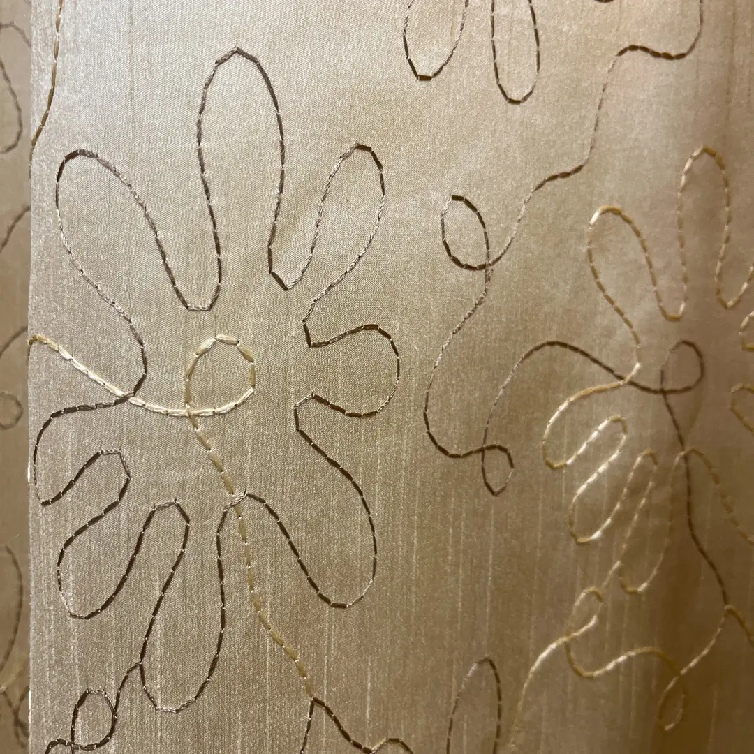 Tenda in taffetà color oro con fiori astratti ricamati ton sur ton
