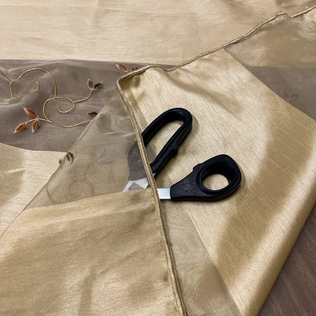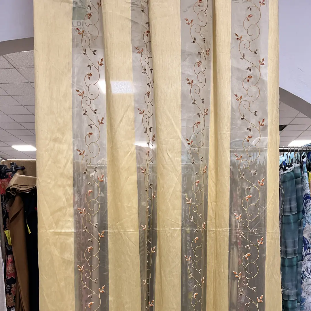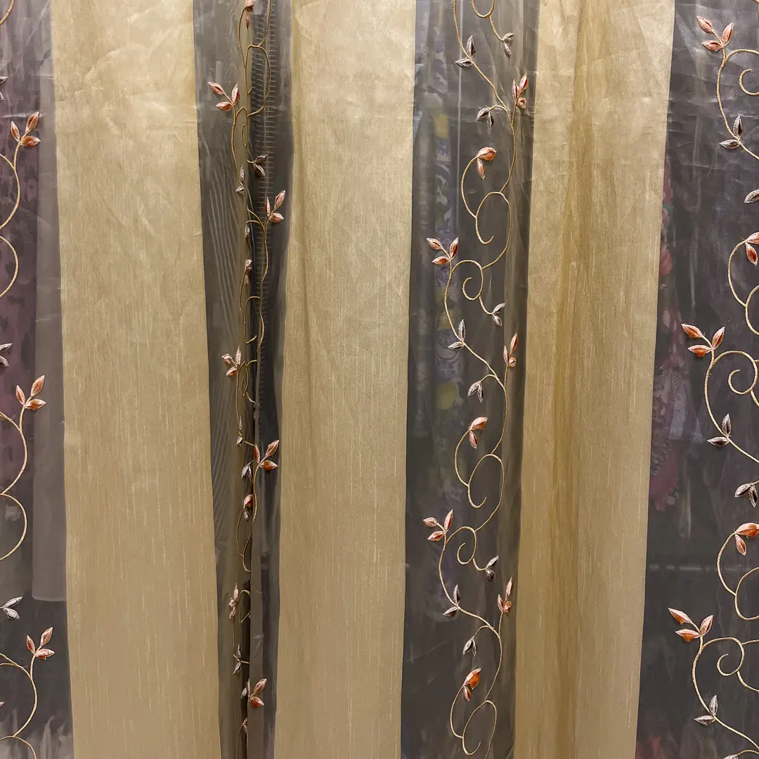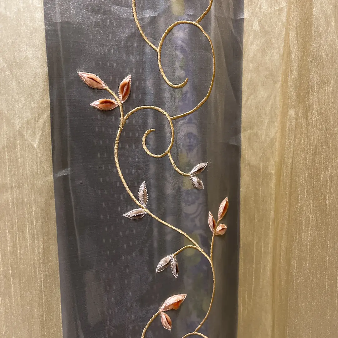 Il tessuto è costruito a fasce verticali piene in taffetà color oro caldo intervallate da bande in organza trasparente della stessa tonalità, che alleggeriscono l’insieme e lasciano filtrare la luce con un effetto morbido e diffuso. Sulle bande leggere corre un ricamo a ramage con piccoli germogli in tonalità rosa antico e tortora, che crea un disegno sinuoso e raffinato adatto sia ad ambienti classici che contemporanei.