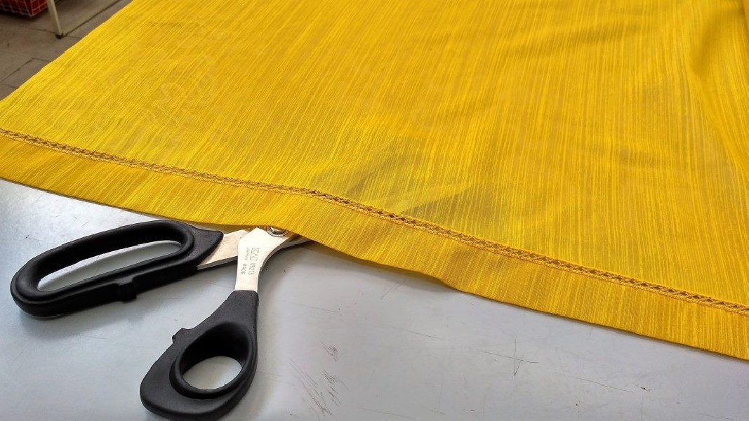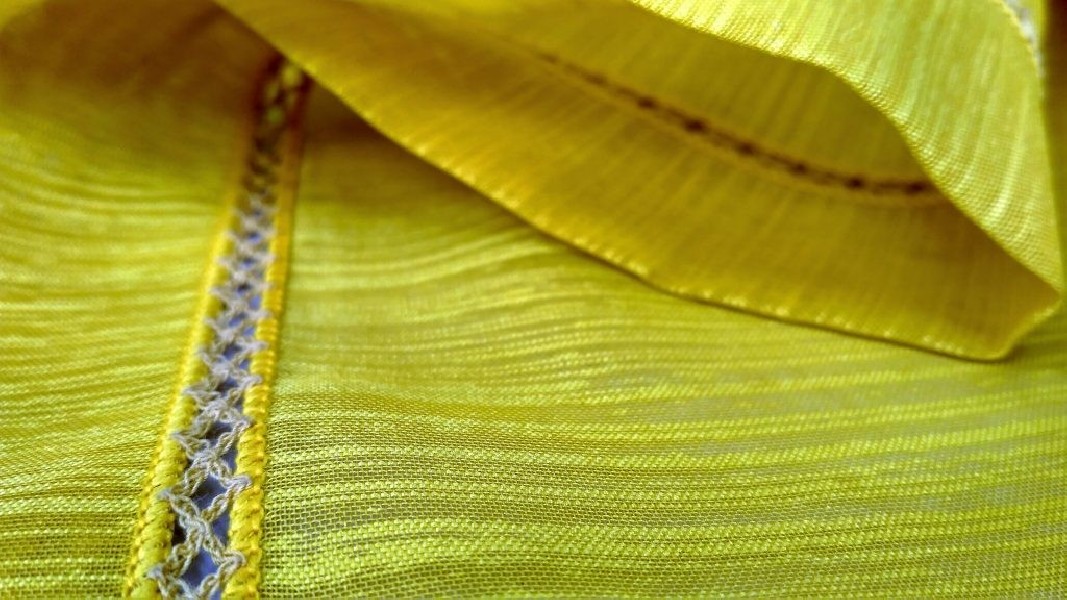 Color giallo intenso, con riflessi curry e senape brillante. Bordato con crochet.
