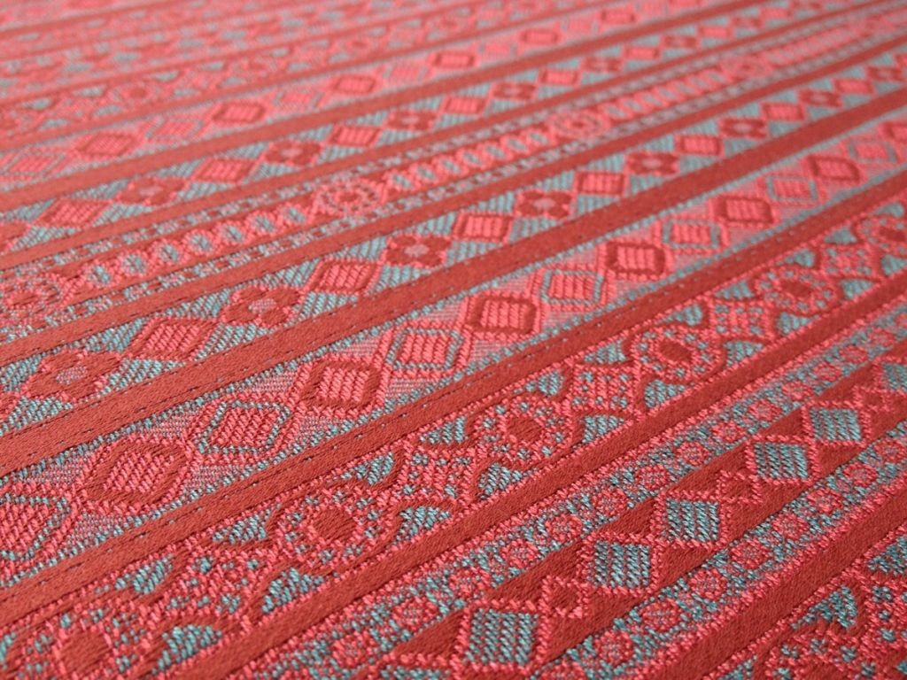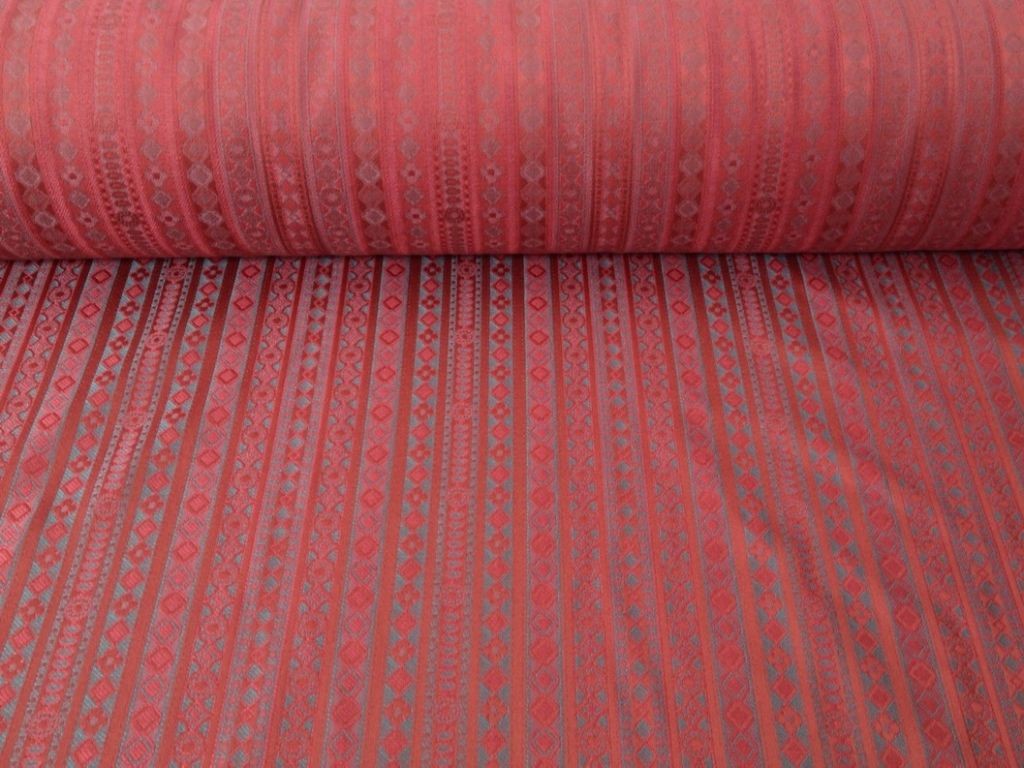 Tessuto in Puro Cotone in tinta rosso-porpora con ripetuta fantasia geometrica.