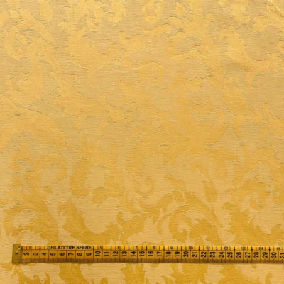 La trama, tipica del damasco, si distingue per la sua ricca lavorazione jacquard che crea un motivo ornamentale raffinato e tridimensionale: ampie volute e fogliami stilizzati si alternano in giochi di luce opachi e lucidi, grazie all’effetto cangiante dei filati metallici oro inseriti direttamente nel tessuto.