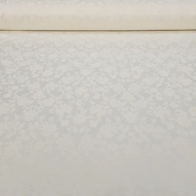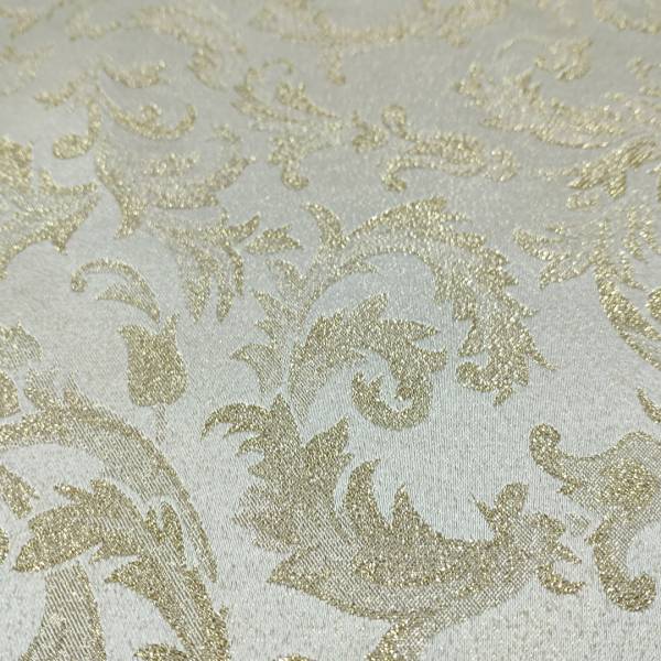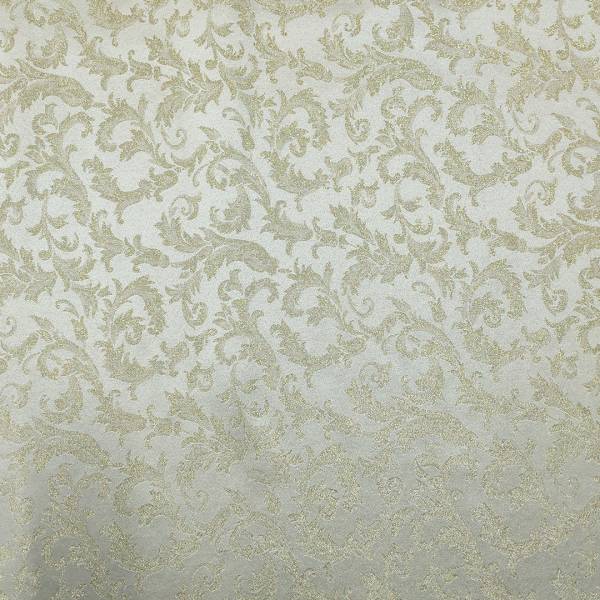 Tessuto damascato per tovaglie che si presenta con un fondo color avorio molto elegante, impreziosito da una pregiata fantasia oro.