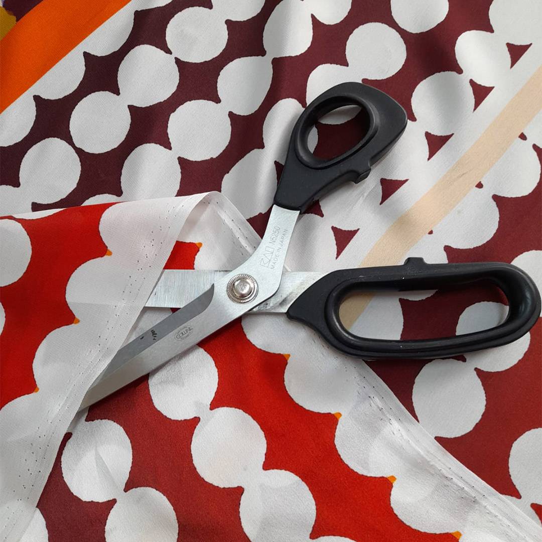 L’interazione tra la lucentezza del raso e i disegni astratti crea un effetto visivo dinamico, dove i riflessi cambiano a seconda della luce e del movimento del tessuto.
