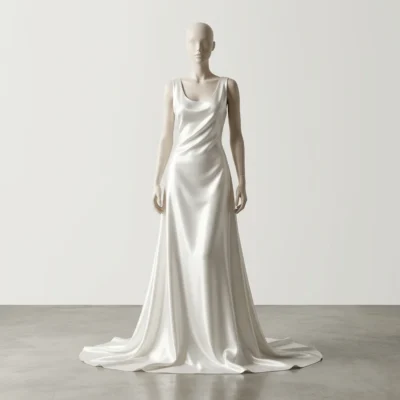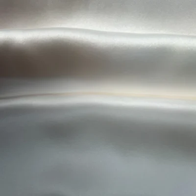 è un raso in pura seta da abbigliamento caratterizzato da una superficie estremamente liscia e luminosa, riflettendo la luce con un effetto specchiato morbido e sofisticato.