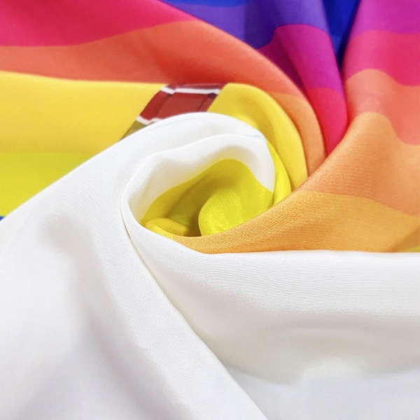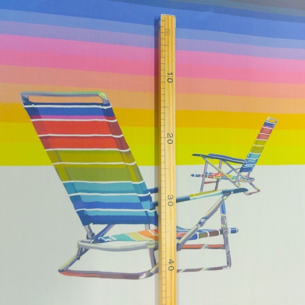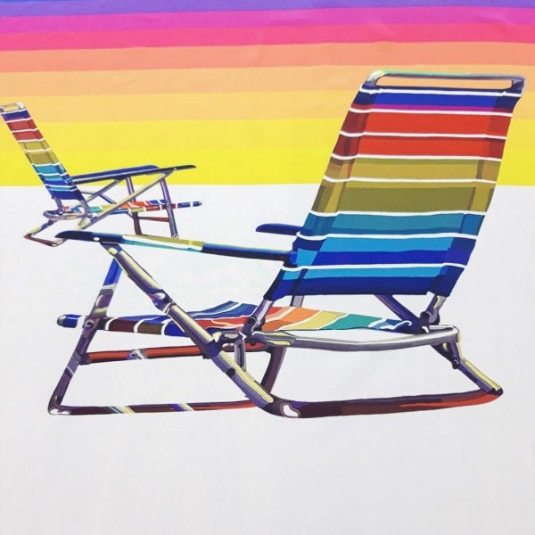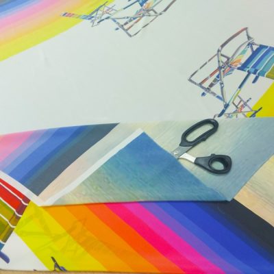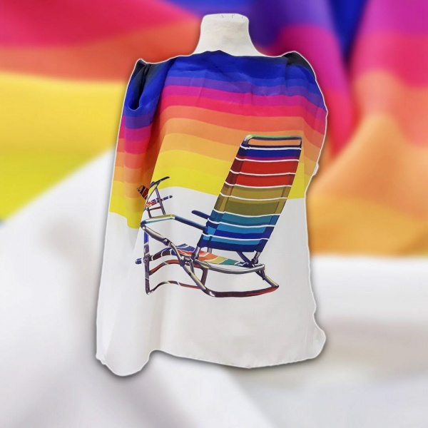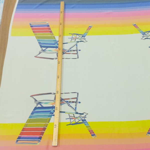 Tessuto leggero e morbido con stampa vivace, su base di colore bianco panna e strisce colorate che vanno dal nero, blu scuro, indaco, rosso fragola, arancio e giallo; al di sopra delle sdraie da spiaggia multicolore in perfetto tema estivo.