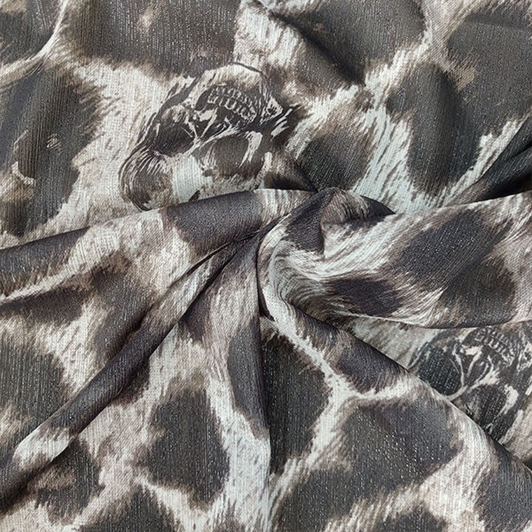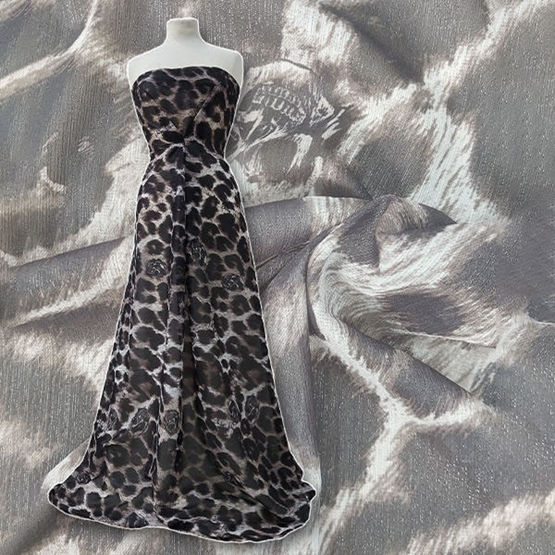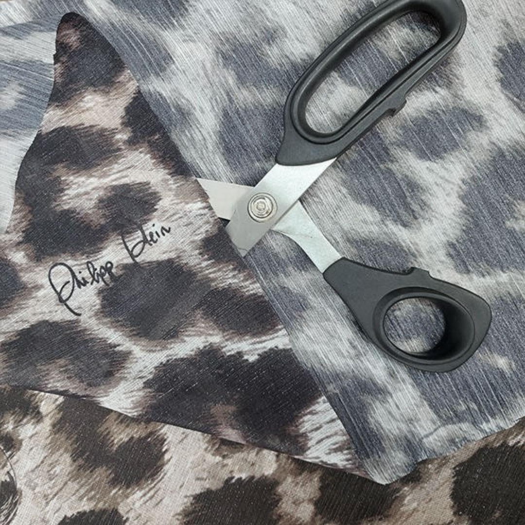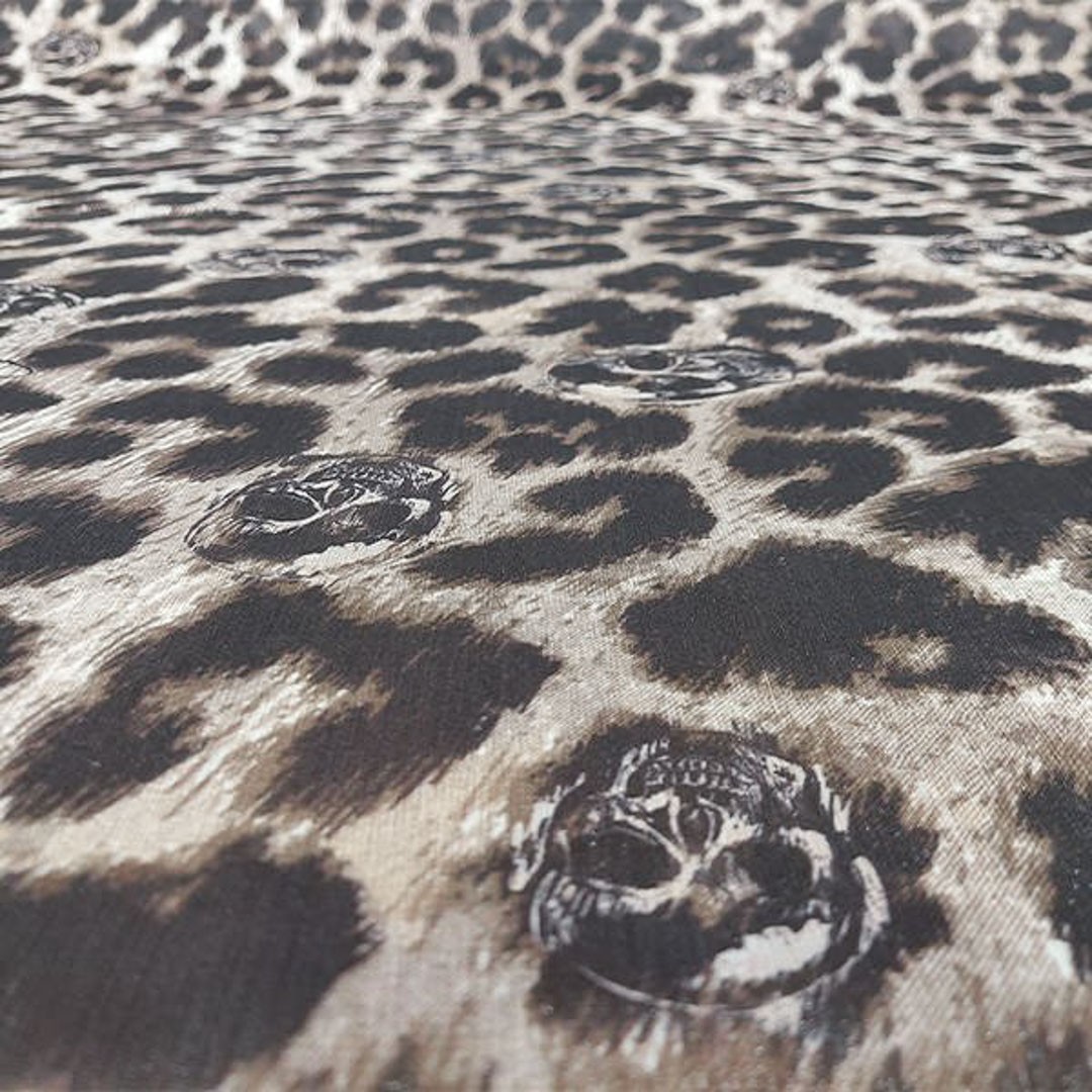 Esclusivo tessuto elasticizzato, con motivi maculati dai toni scuri che spaziano dal nero, marrone scuro e tortora chiaro, impreziosito da una lucente filigrana argentata e dal dettaglio particolare di piccoli teschi, marchio del famoso stilista Philip Plein.