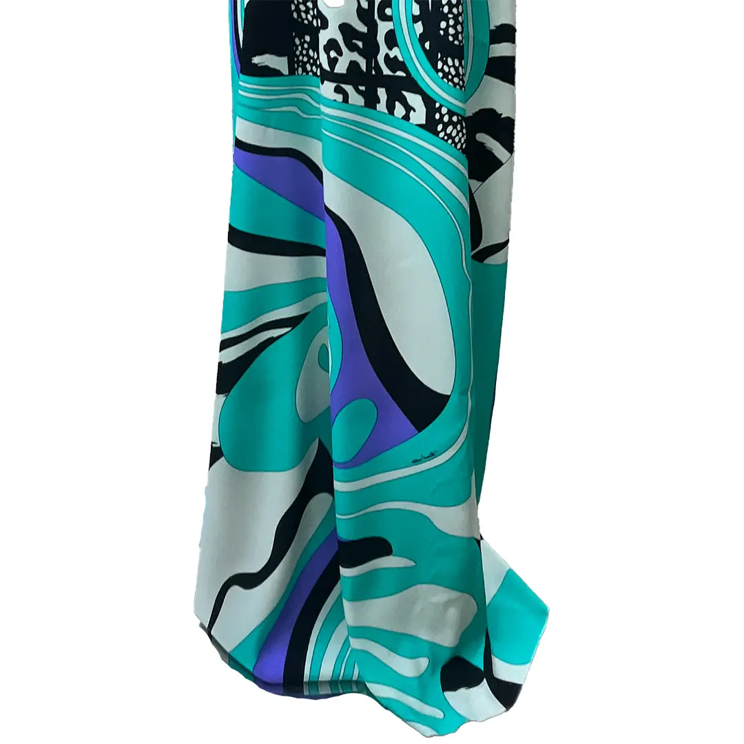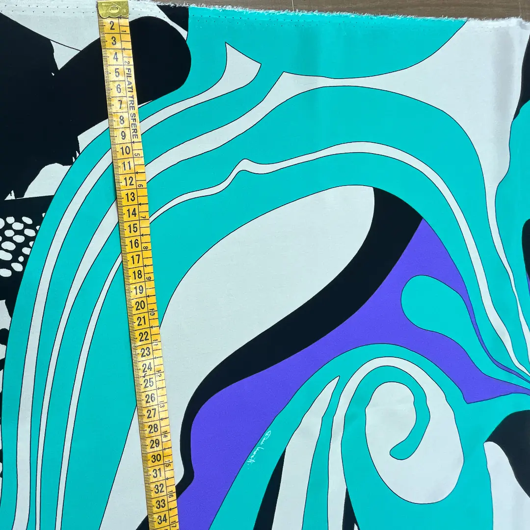 Linee fluide e curve morbide, in un intenso turchese, si intrecciano a forme geometriche più nette, creando un movimento dinamico sulla superficie del tessuto.
