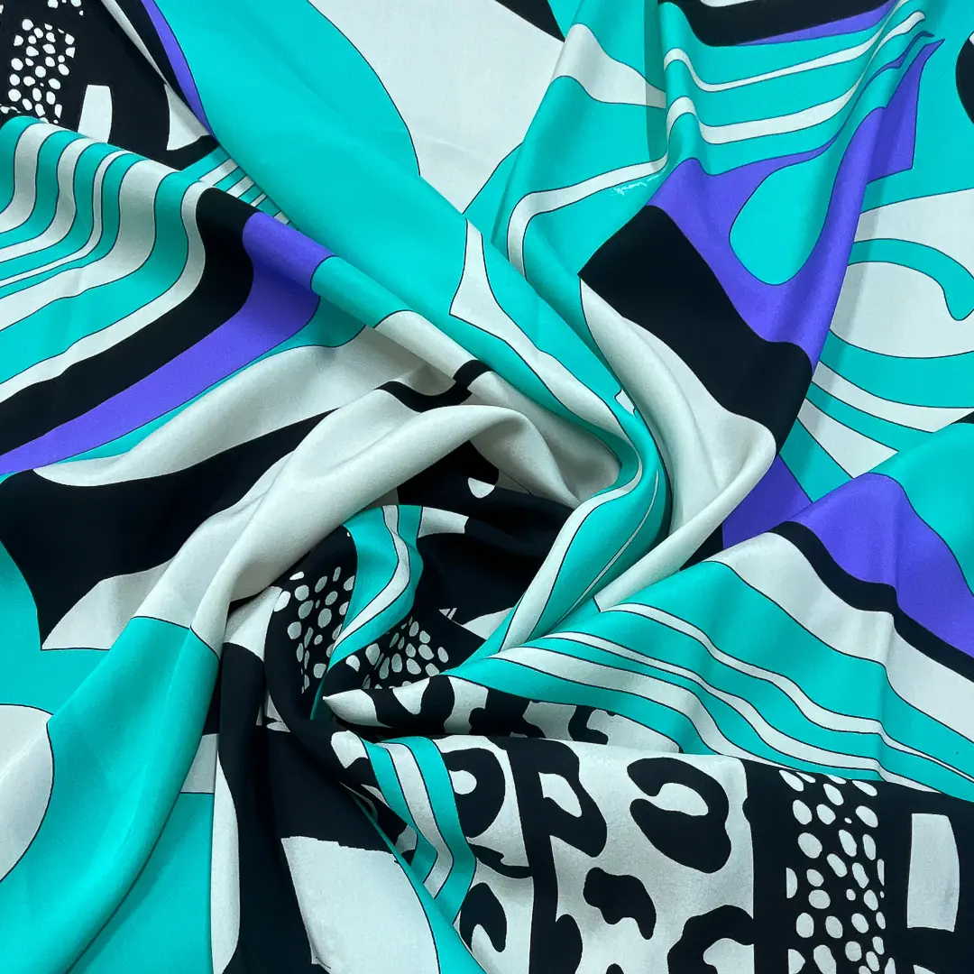 La lucentezza caratteristica del raso di seta esalta i colori e i motivi, creando un effetto visivo di grande impatto.