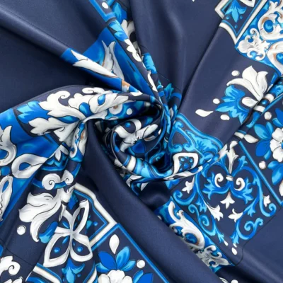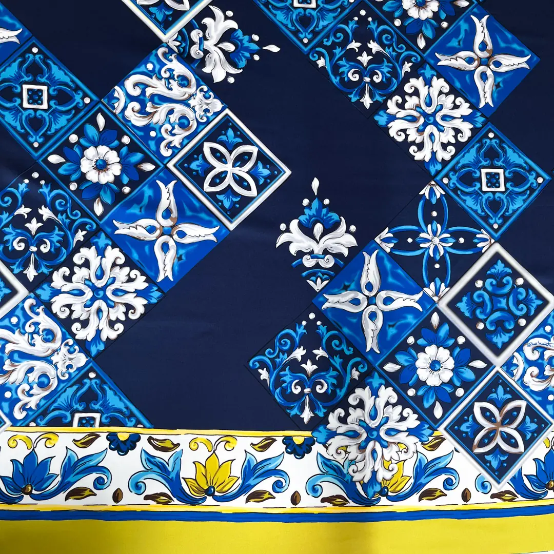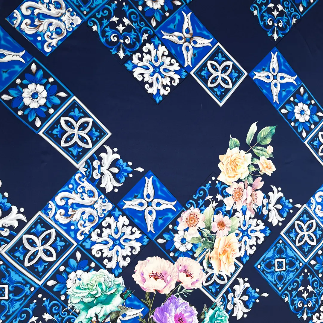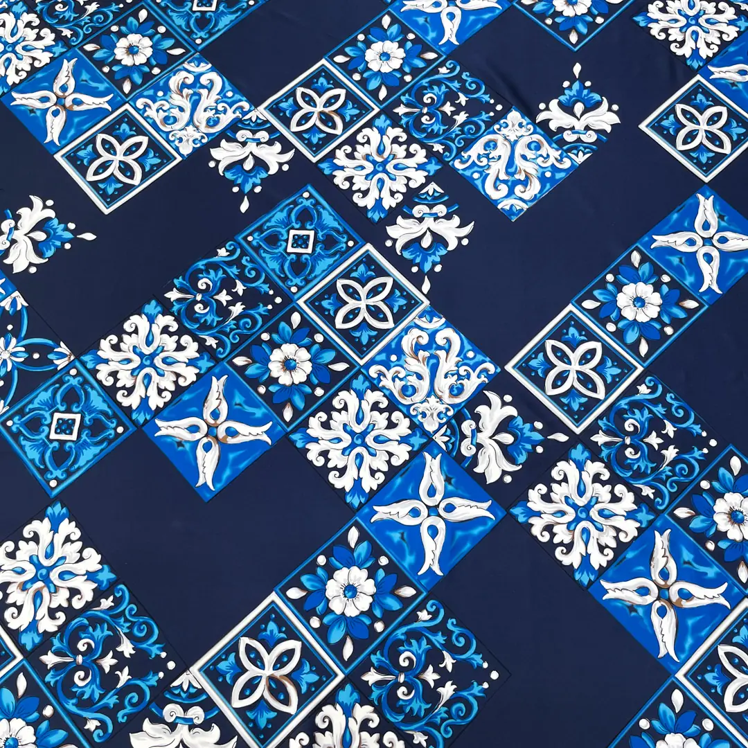 La sua base in blu profondo conferisce un’aura di classe e mistero, mentre i riquadri decorati con ghirigori in sfumature di avorio e azzurro creano un suggestivo contrasto, arricchendo il tessuto di movimento e armonia visiva.