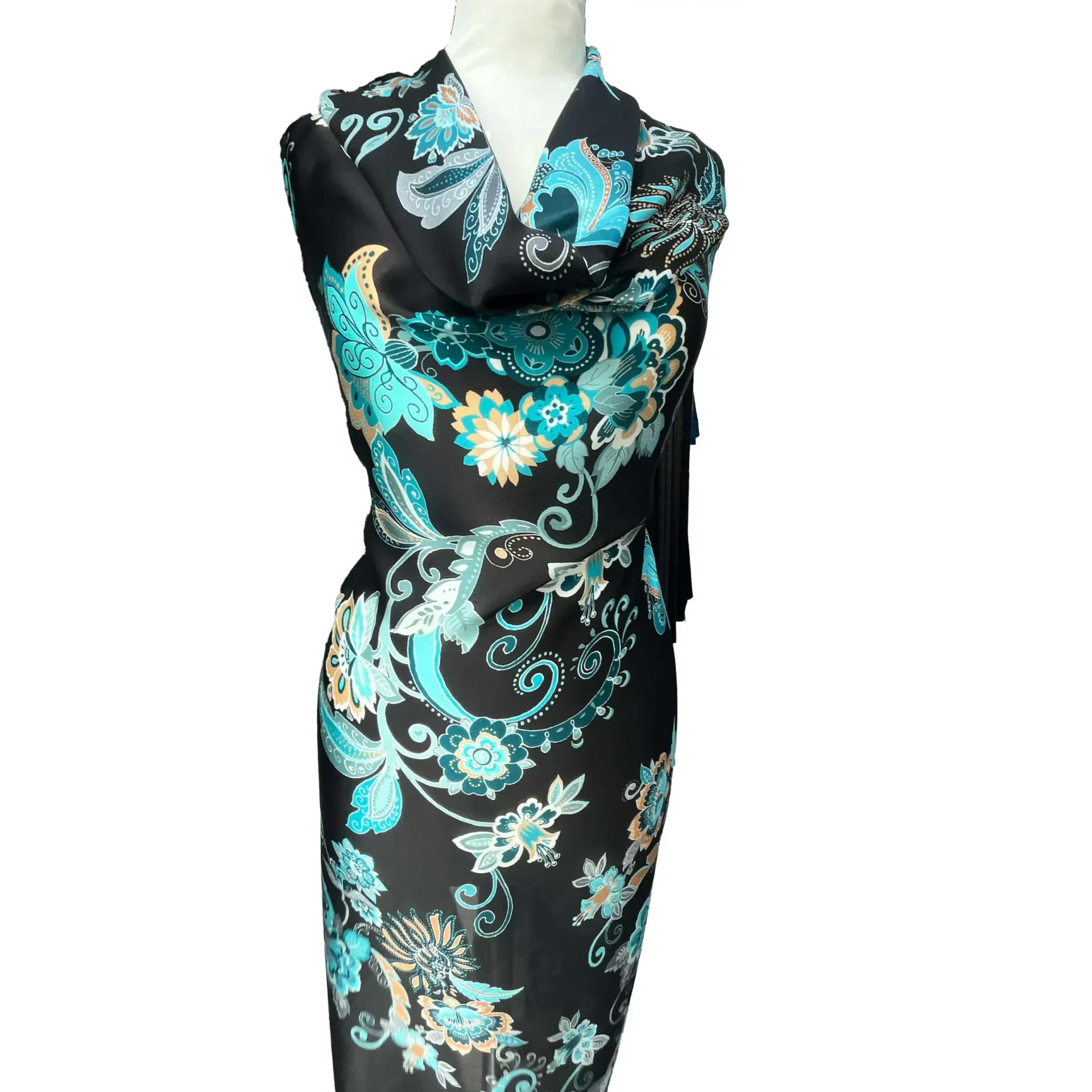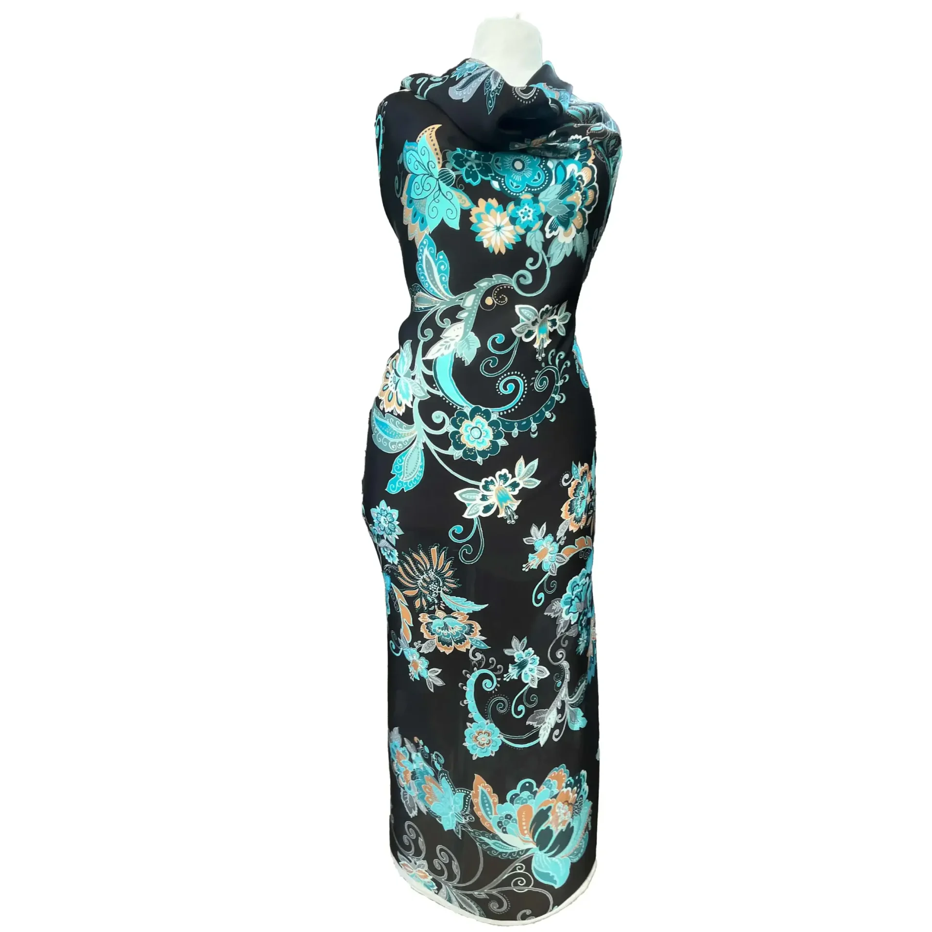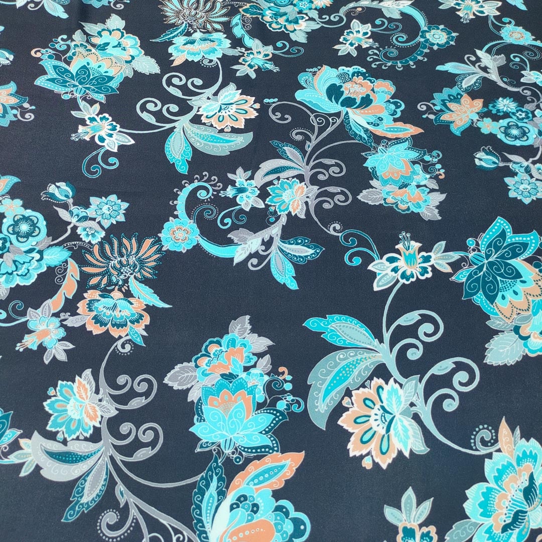 La stampa è composta da un intreccio armonioso di elementi floreali e paisley, nei toni del turchese, azzurro, bianco e arancione.