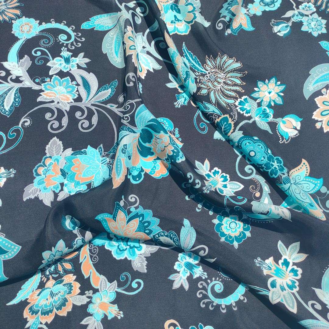 È un tessuto leggero, in pura seta made in italy, caratterizzato da una base nera che funge da sfondo ideale per il suo elaborato motivo decorativo.