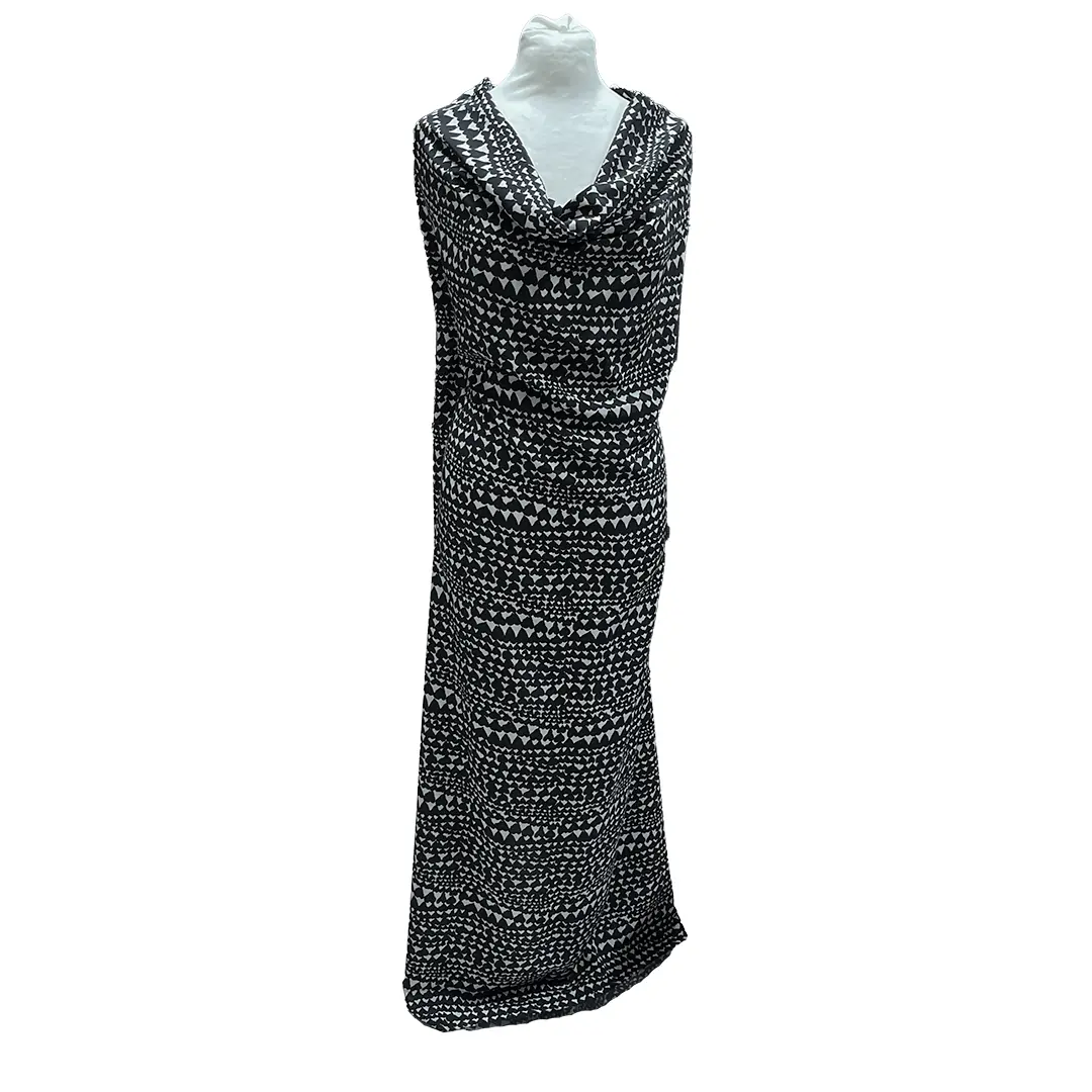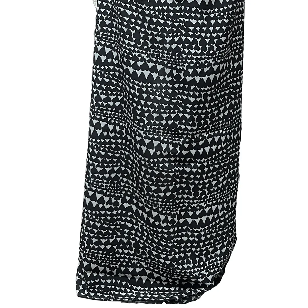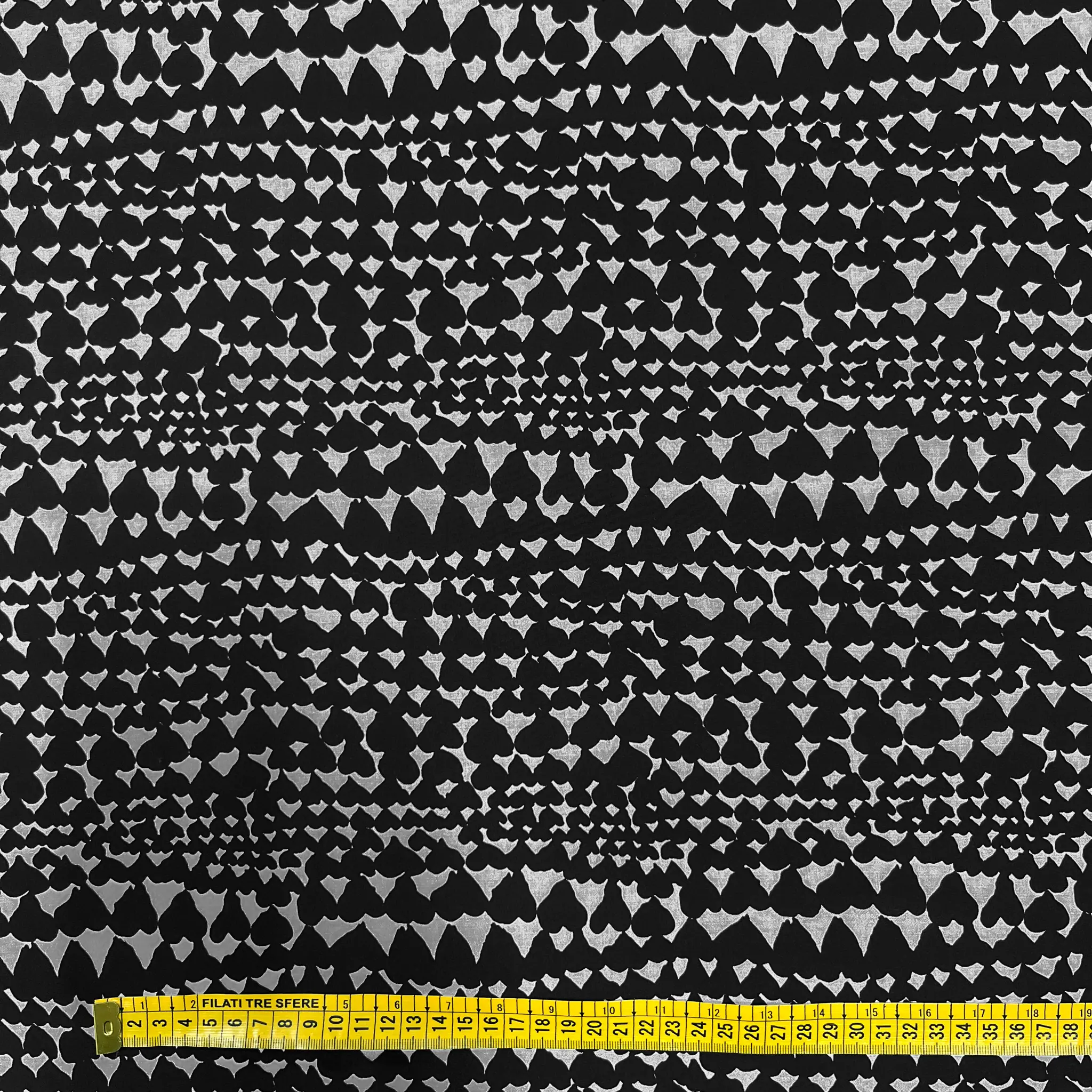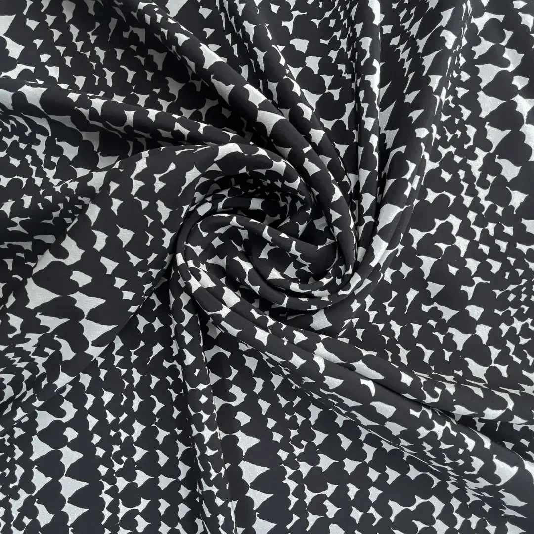 Questo raso di seta si distingue per il suo fondo nero intenso, che fa da sfondo ideale alle stampe grigio chiaro a forma di cuore stilizzato. Queste figure geometriche creano un contrasto visivo elegante e moderno, senza risultare eccessivo.
