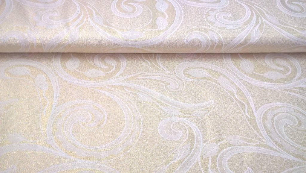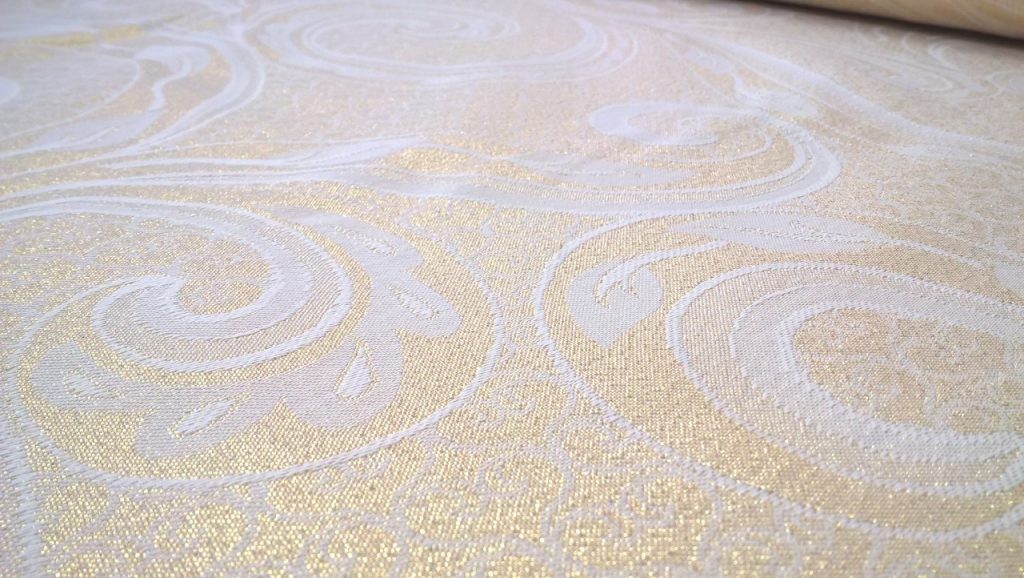 Tessuto arredamento double face sfondo panna con motivi dorati.
