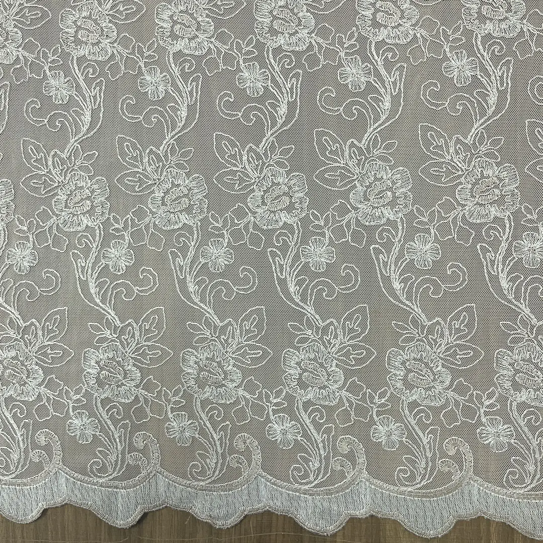 Tenda in tulle ricamato con disegno di rose colorate avorio, smerlata in fondo
