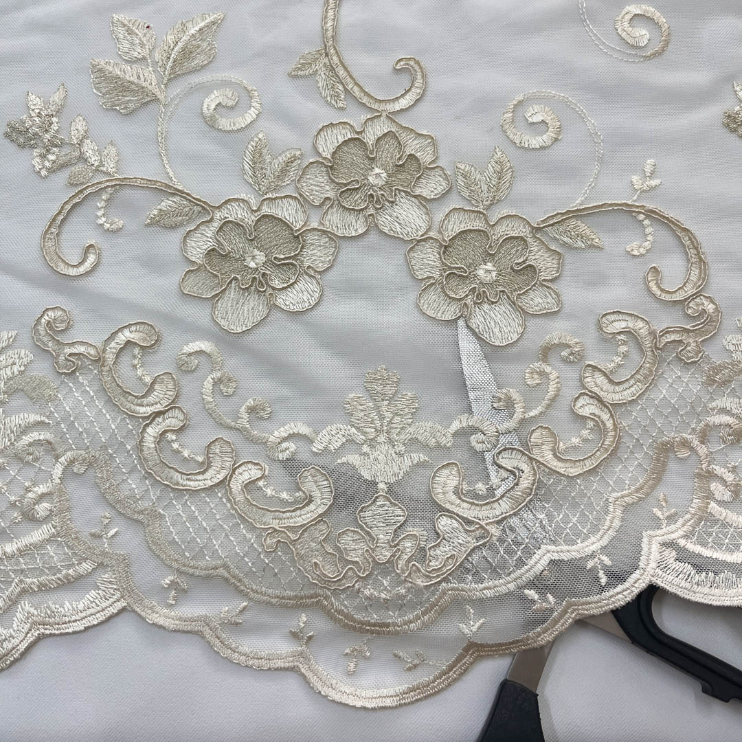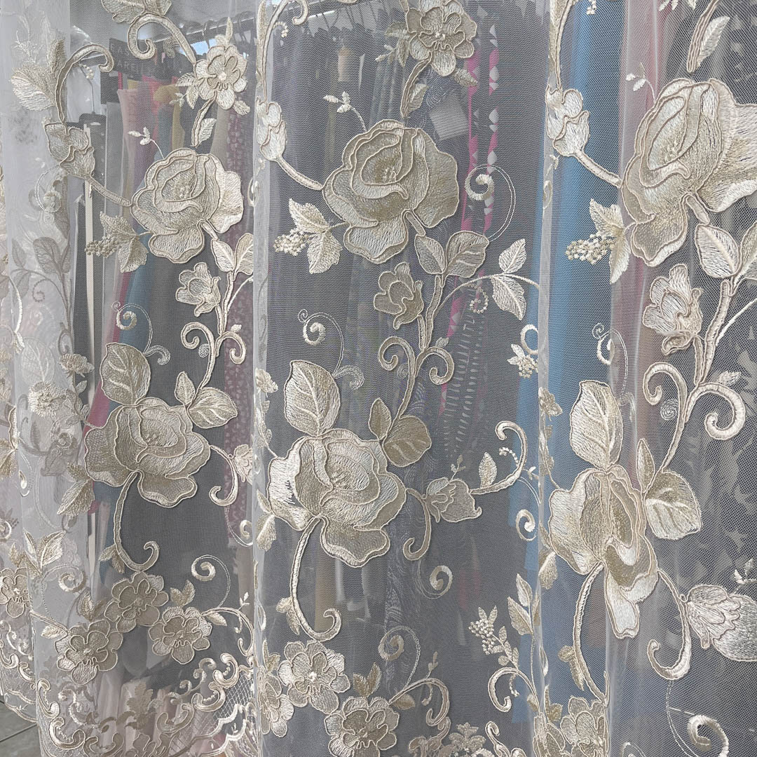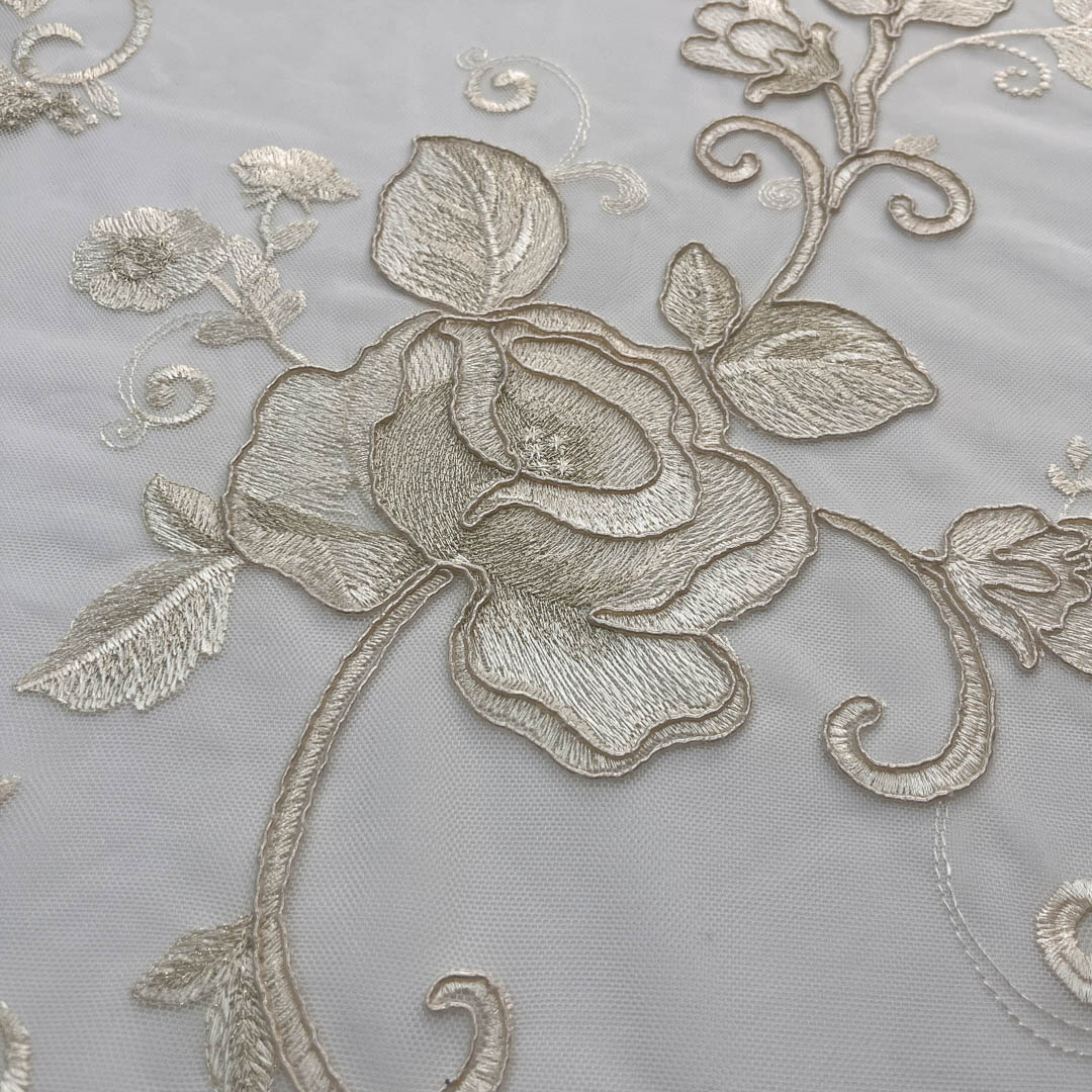 Questo contrasto cromatico sottile tra il bianco del tulle e l’avorio dei ricami contribuisce a un effetto visivo delicato ma ricercato. Il disegno floreale è un elemento senza tempo che si sposa bene sia con ambienti classici sia con arredamenti moderni, dove può diventare un dettaglio decorativo di spicco.