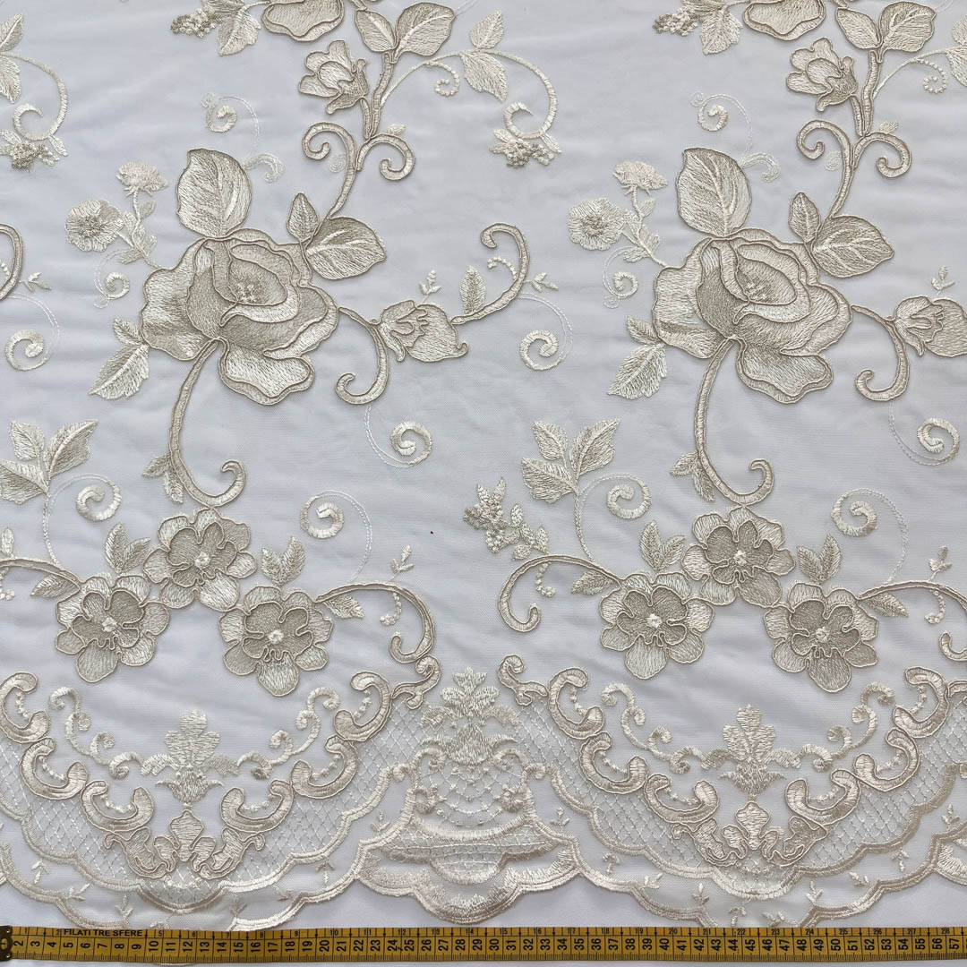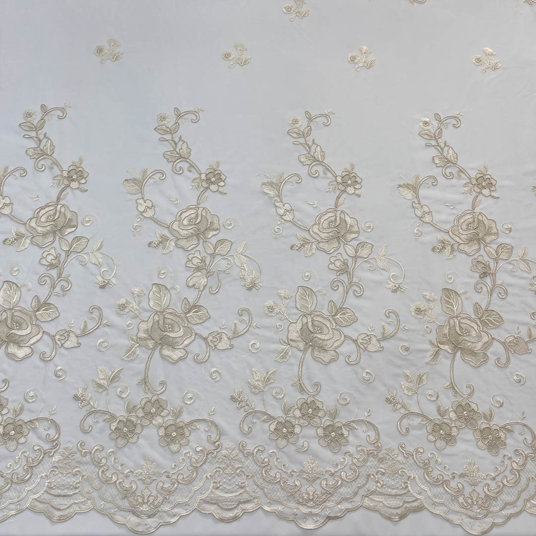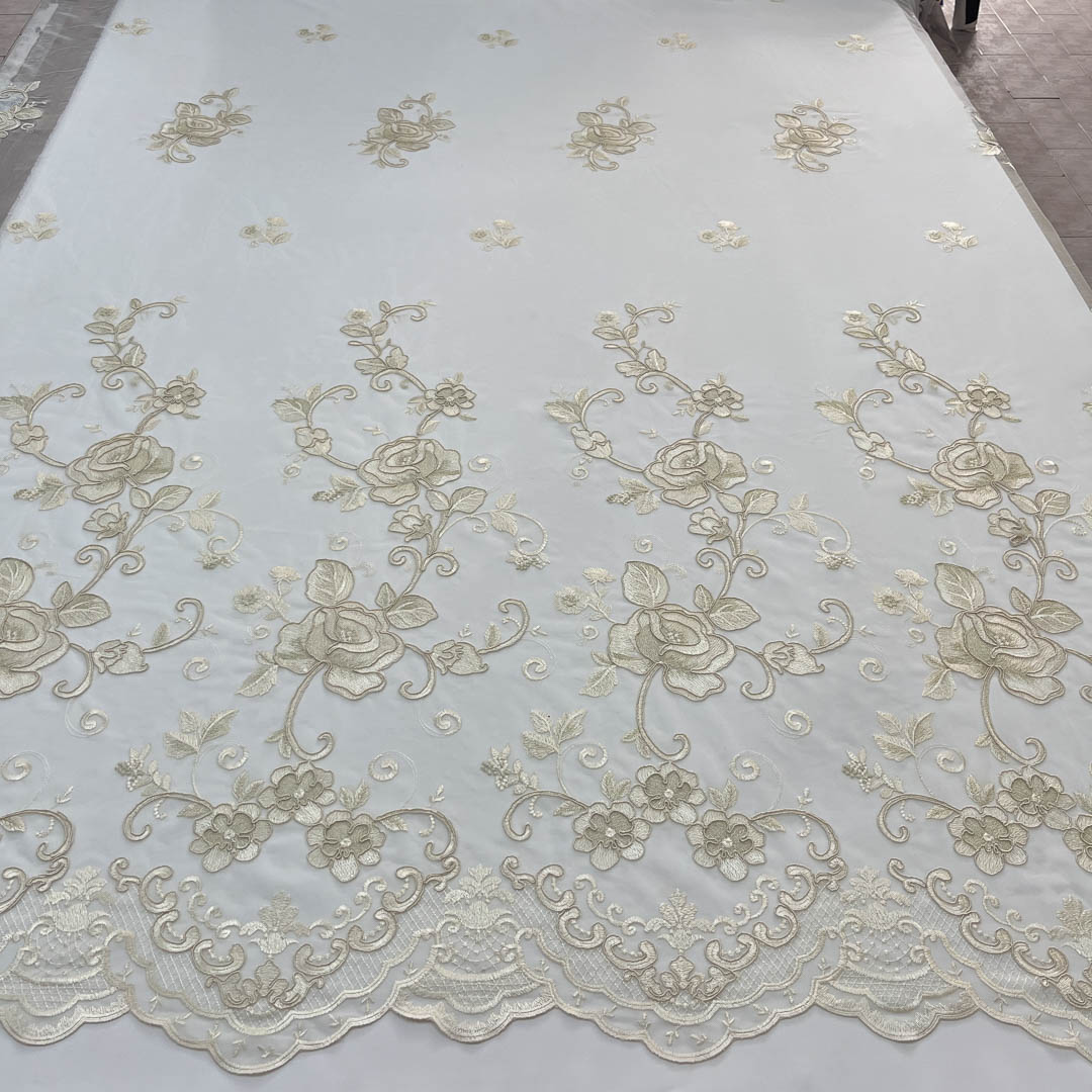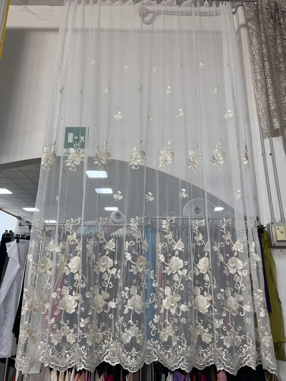 Questo contrasto cromatico sottile tra il bianco del tulle e l’avorio dei ricami contribuisce a un effetto visivo delicato ma ricercato. Il disegno floreale è un elemento senza tempo che si sposa bene sia con ambienti classici sia con arredamenti moderni, dove può diventare un dettaglio decorativo di spicco.