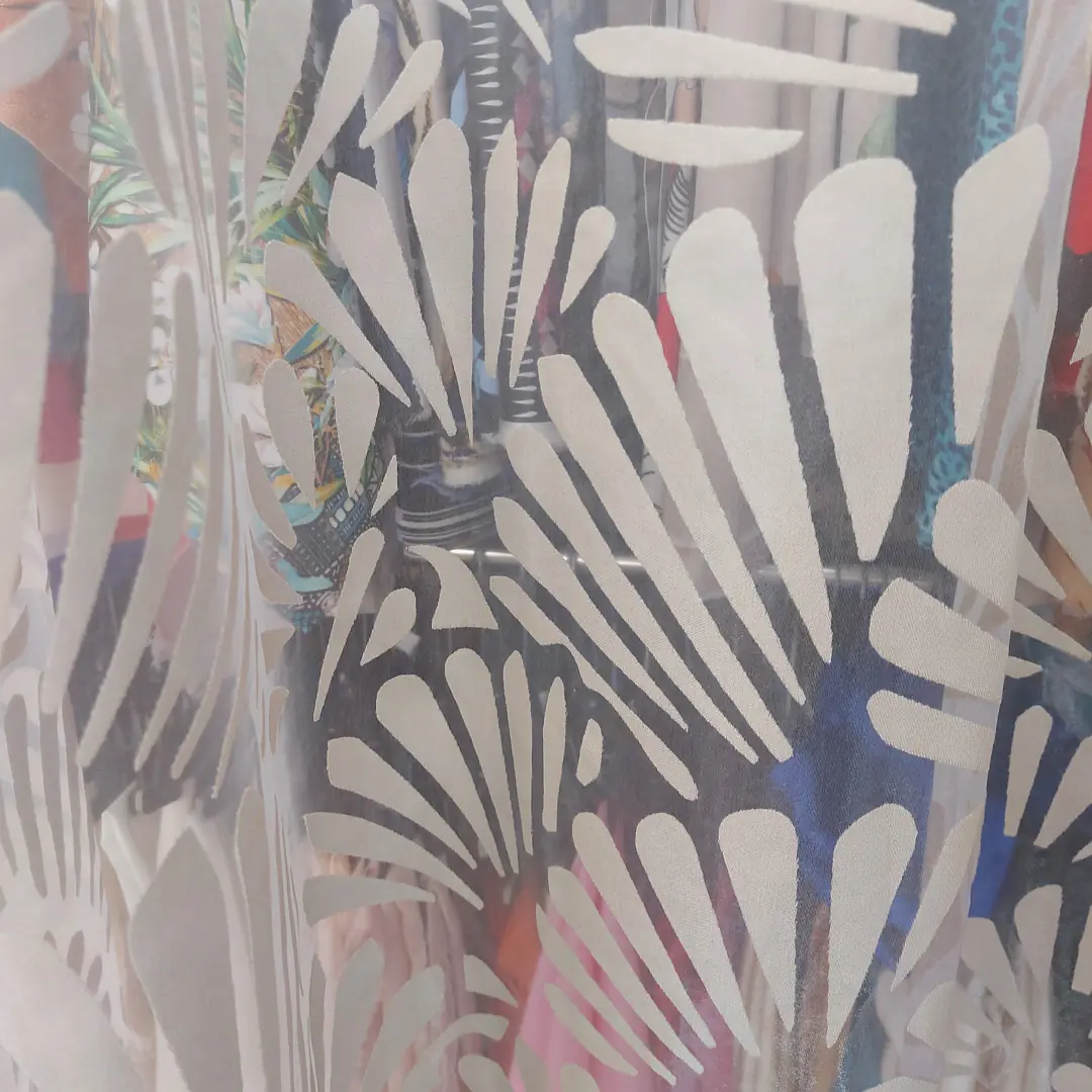Questo abbinamento permette di ottenere l’effetto del devorè: attraverso un trattamento chimico mirato, la fibra di viscosa viene parzialmente dissolta, lasciando inalterato il poliestere.