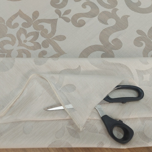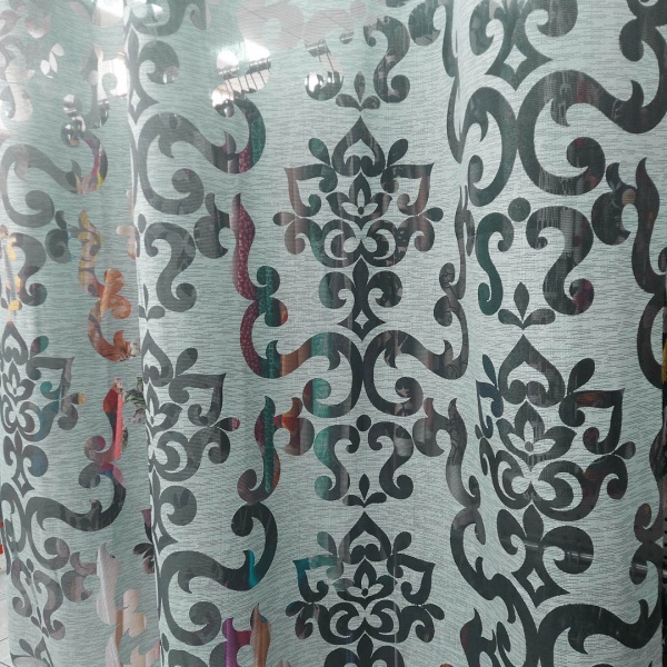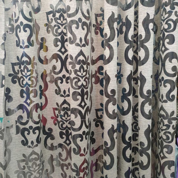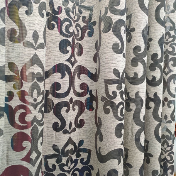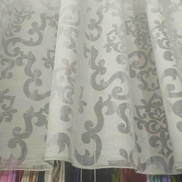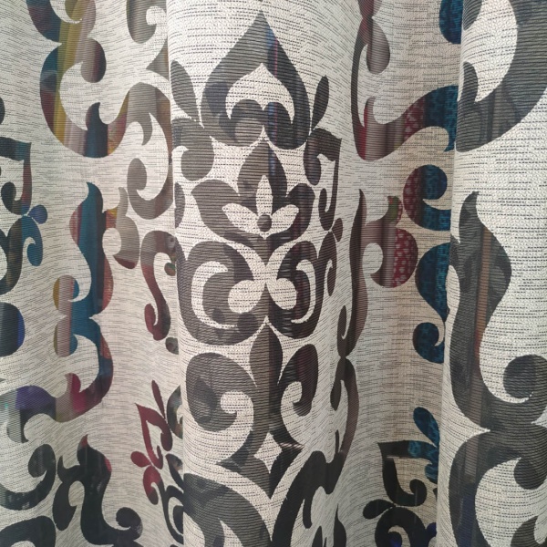 La trama del tendaggio è leggermente ruvida e irregolare, conferendo al materiale una certa consistenza e un aspetto più naturale. Questa caratteristica, unita all’effetto devorè, contribuisce a creare un gioco di luci e ombre che rende il tessuto particolarmente interessante dal punto di vista visivo.