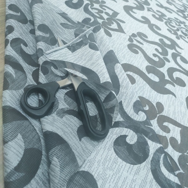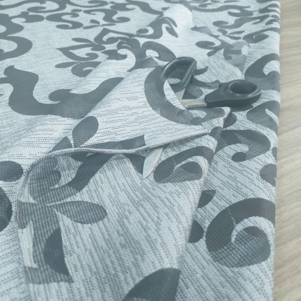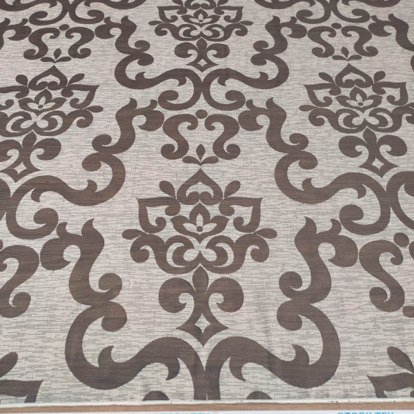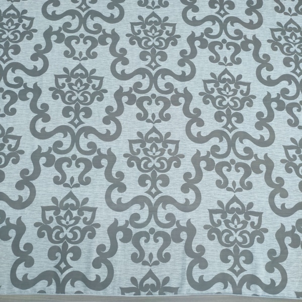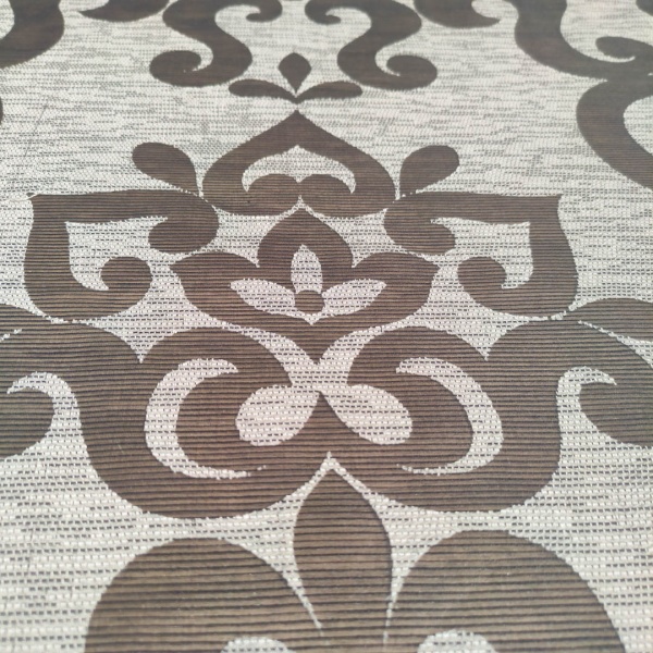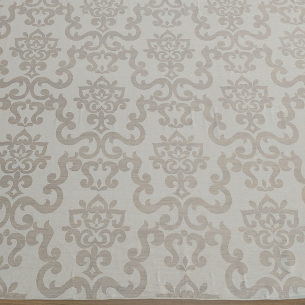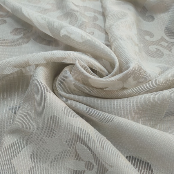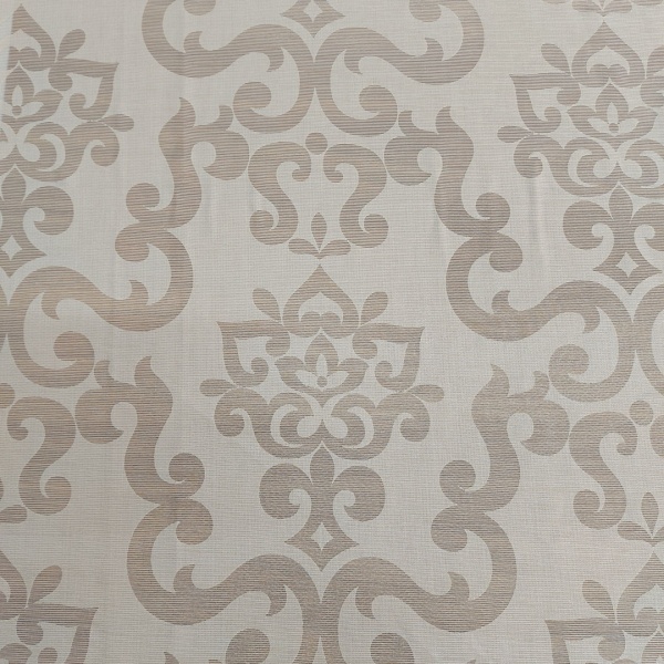 La palette cromatica è sobria ed elegante, con un fondo chiaro che contrasta con il disegno più scuro. Questa combinazione conferisce alla stoffa un aspetto raffinato e discreto, ideale per ambienti che richiedono un tocco di eleganza senza essere troppo invadenti.