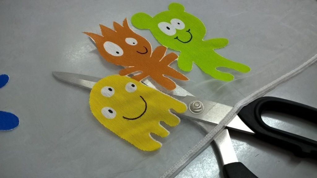 Tessuto per tendaggi in organza da bimbo/a, trasparente con simpatici mostriciattoli colorati.