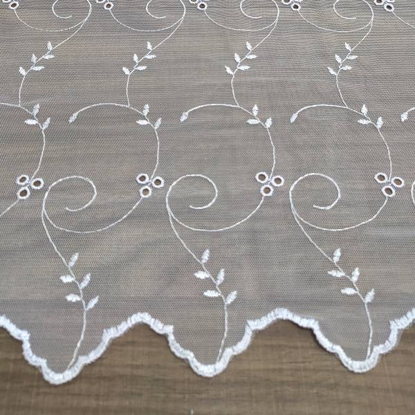 Delicato tulle bianco, impreziosito da un ricamo floreale eseguito con fili dello stesso colore.
