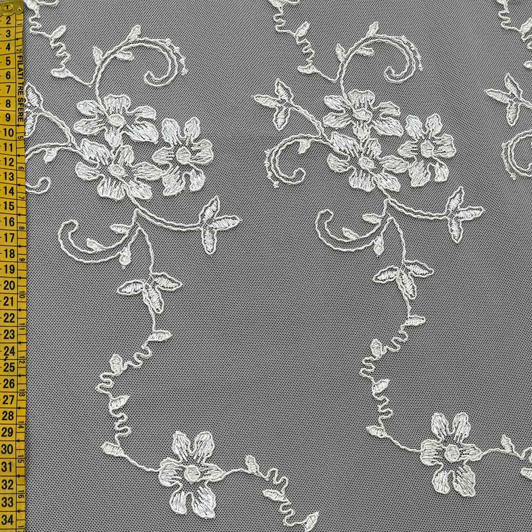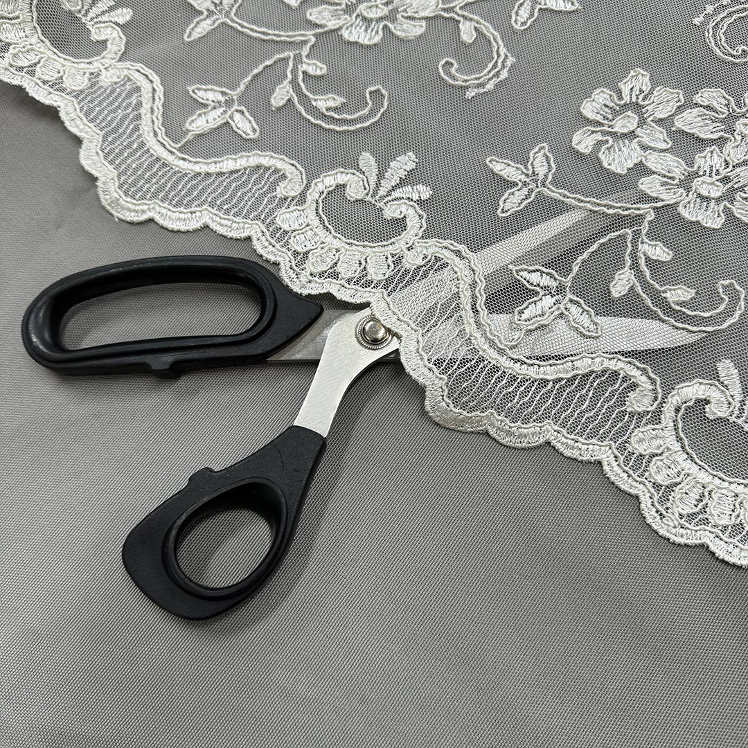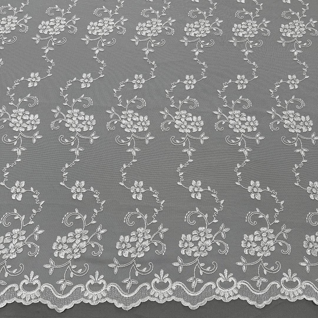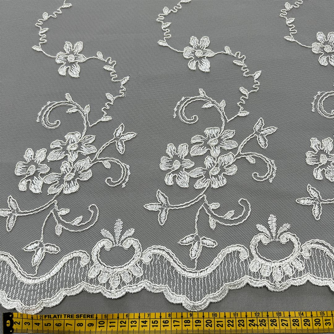 Il tulle ricamato premette alla luce naturale di filtrare delicatamente nella stanza, creando un’atmosfera soffusa ed eterea.