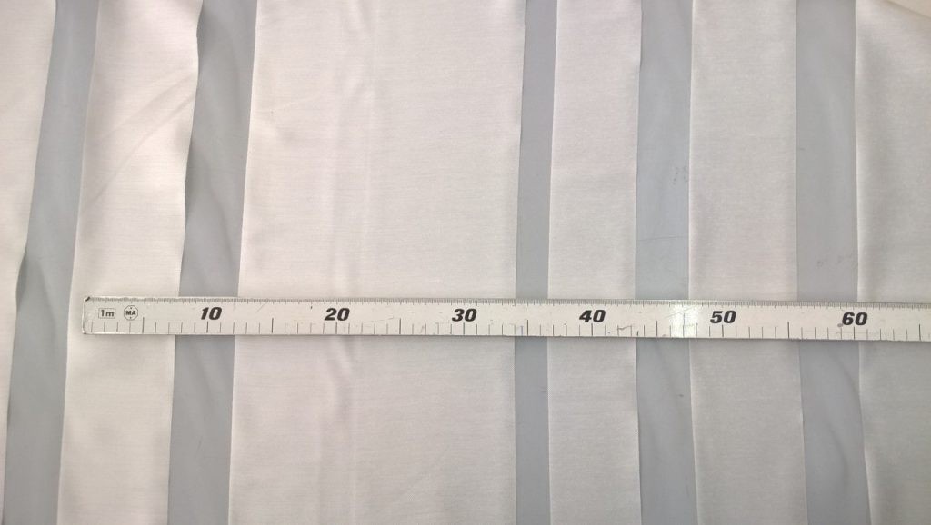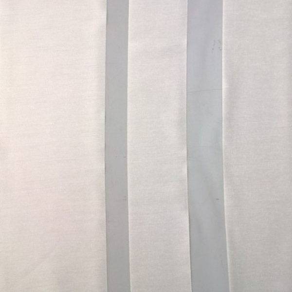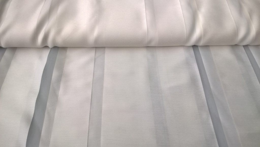 Tessuto in viscosa in tinta unita bianco ottico con fasce semitrasparenti. Ideale per tendaggi semplici e moderni.