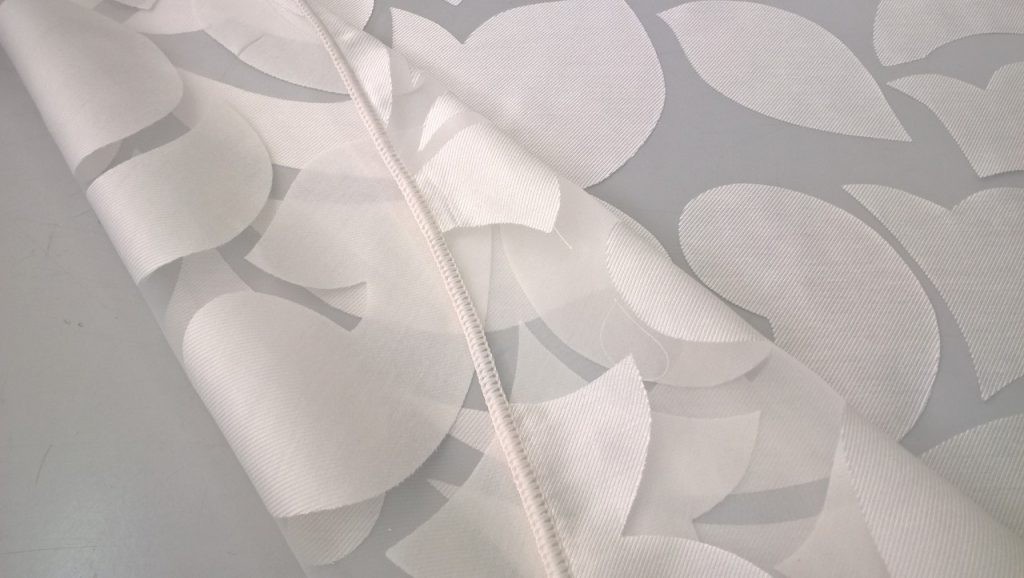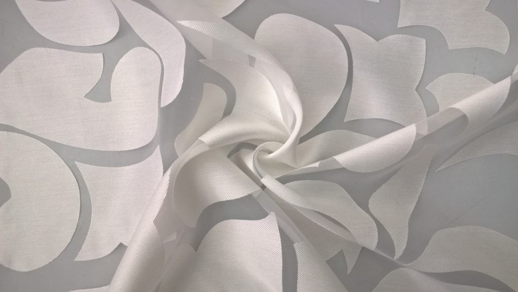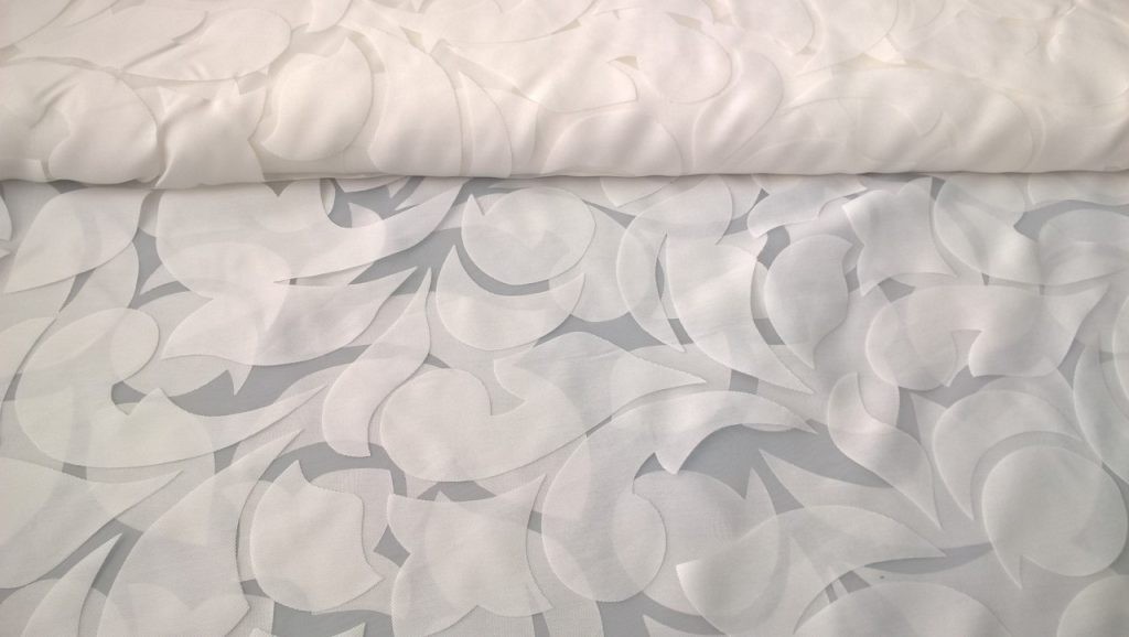Tessuto in viscosa in tinta unita semitrasparente con fantasia a fiori in bianco naturale. Ideale per tendaggi semplici e moderni.