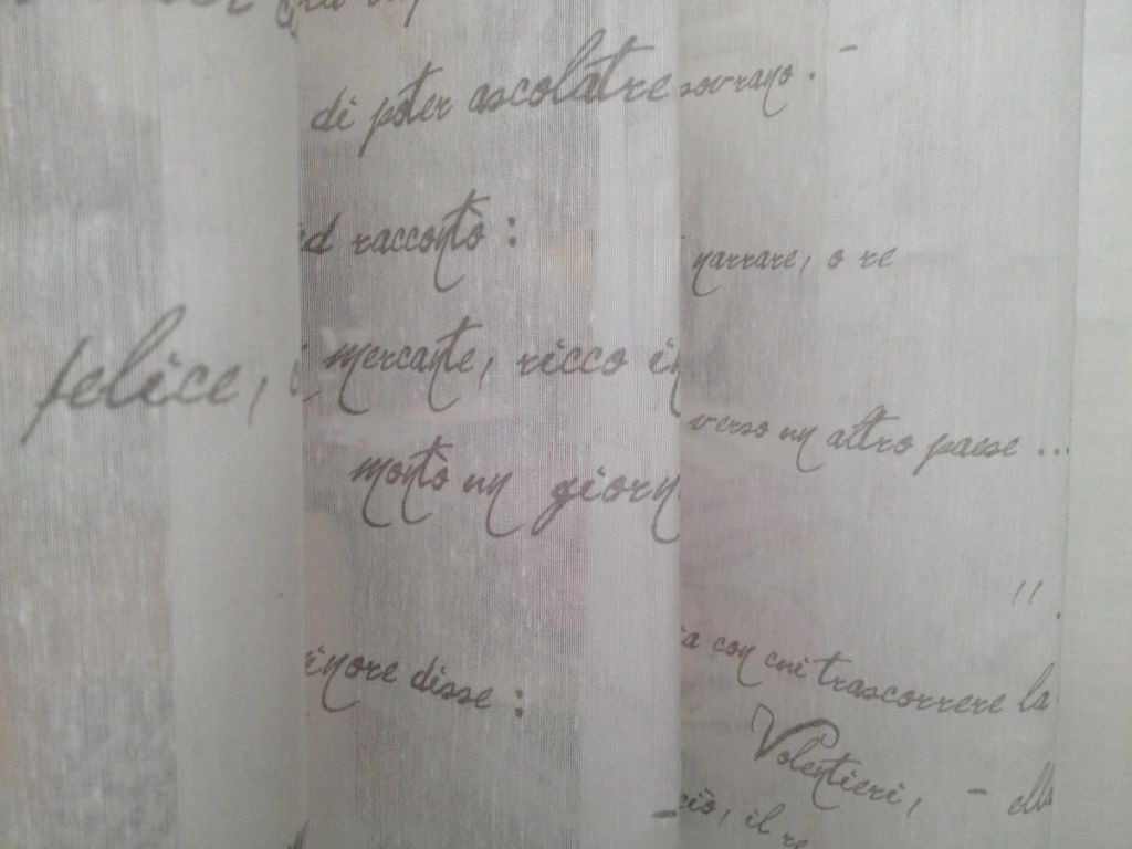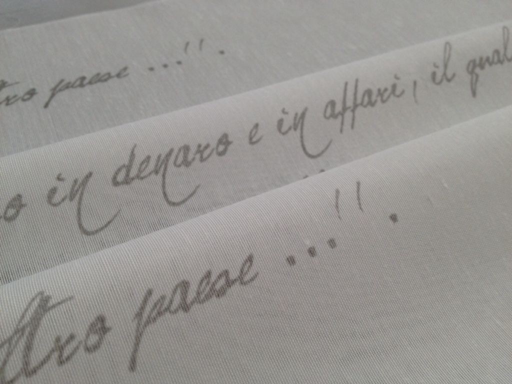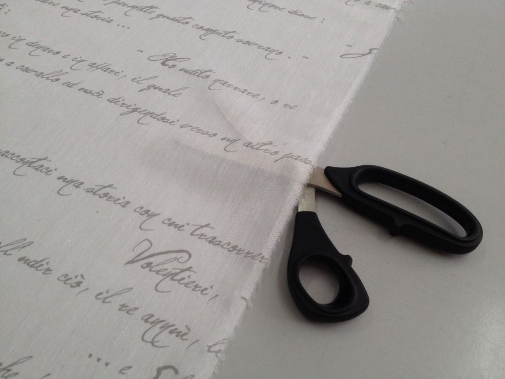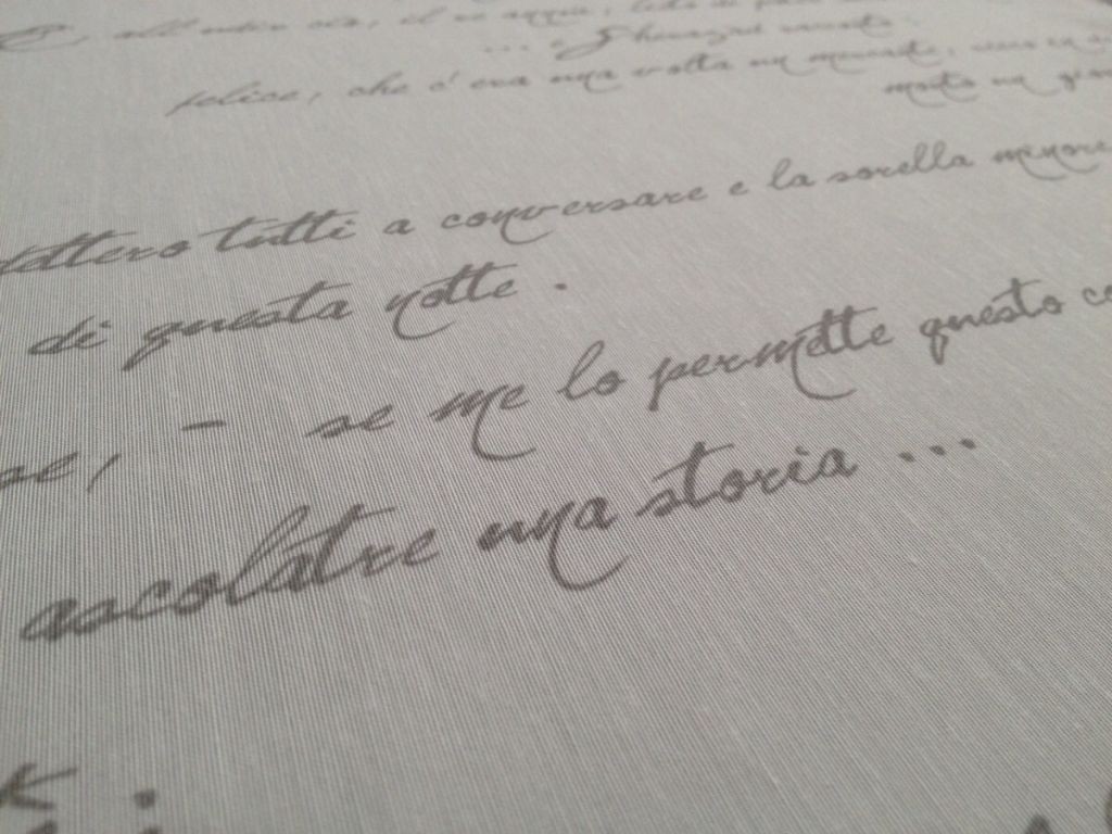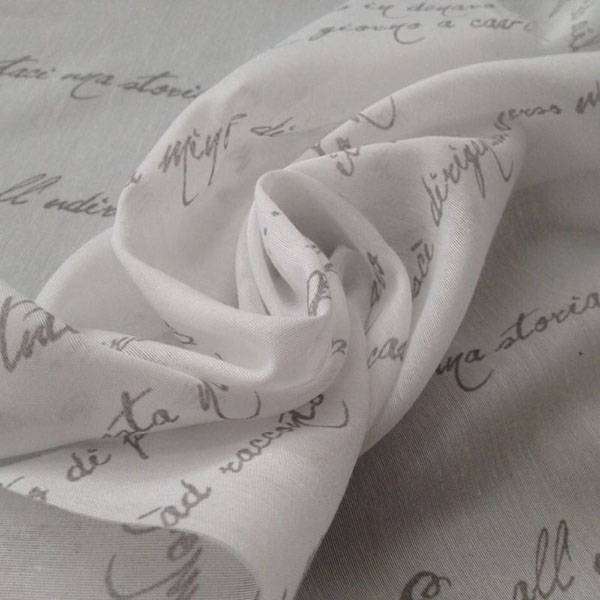 Tessuto con scritte grigie a sfondo bianco.