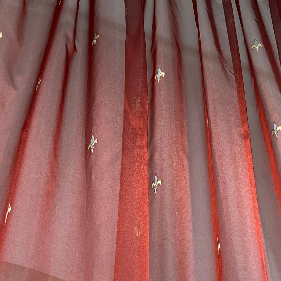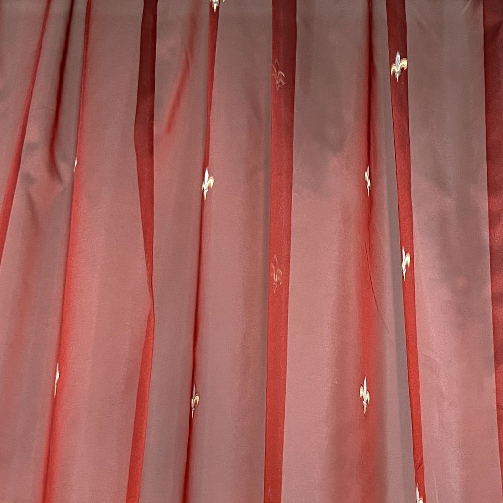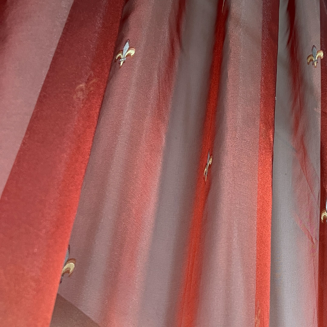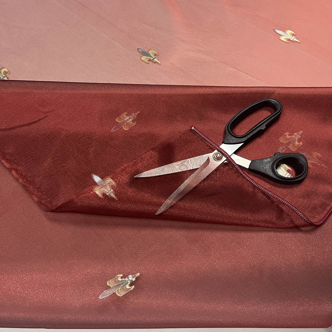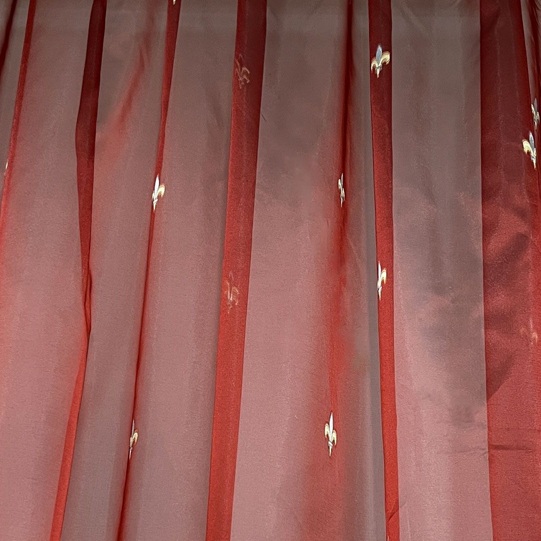 Il colore rosso rubino aggiunge alla stoffa una nota di regalità e calore, mentre i delicati gigli in lamè dorati e argento aggiungono un tocco di glamour e sofisticazione. I dettagli luminosi dei gigli brillano delicatamente al cambiare della luce, creando un effetto visivo incantevole e invitante.