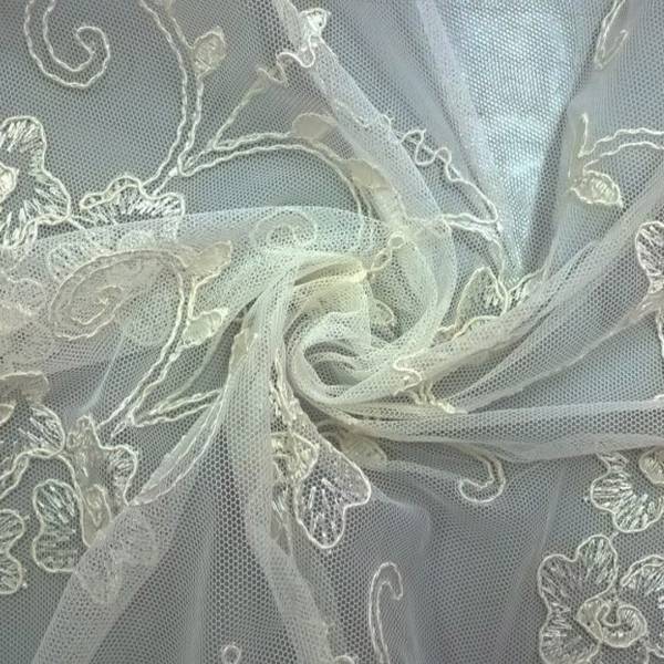 Tulle in rete di color avorio ricamata con grandi fiori in pizzo.