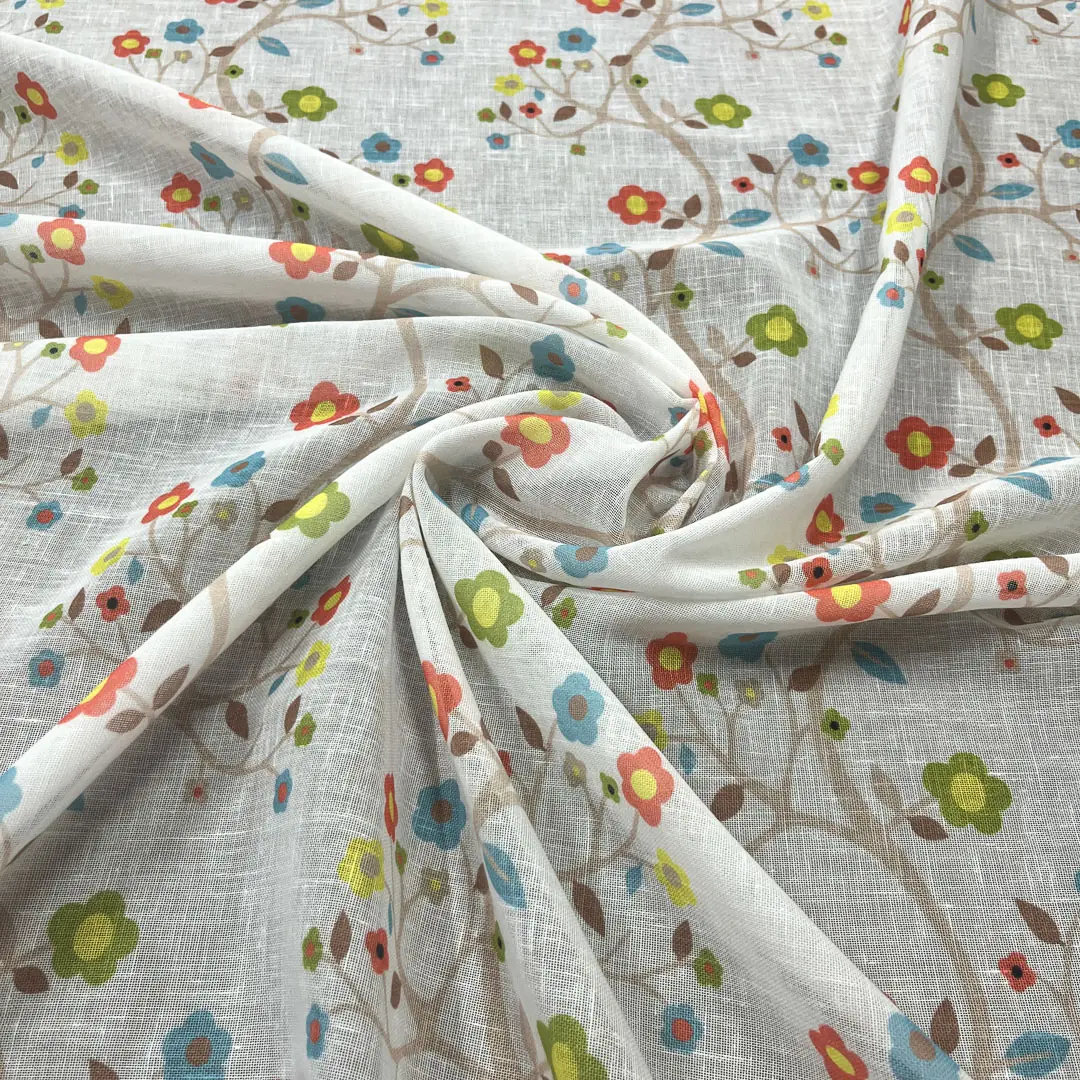 Le foglie, raffigurate in diverse sfumature che variano dal verde salvia all’azzurro tenue, aggiungono movimento e profondità al disegno, mentre la base color avorio del tessuto permette ai colori stampati di risaltare con vivacità senza creare contrasti troppo marcati.