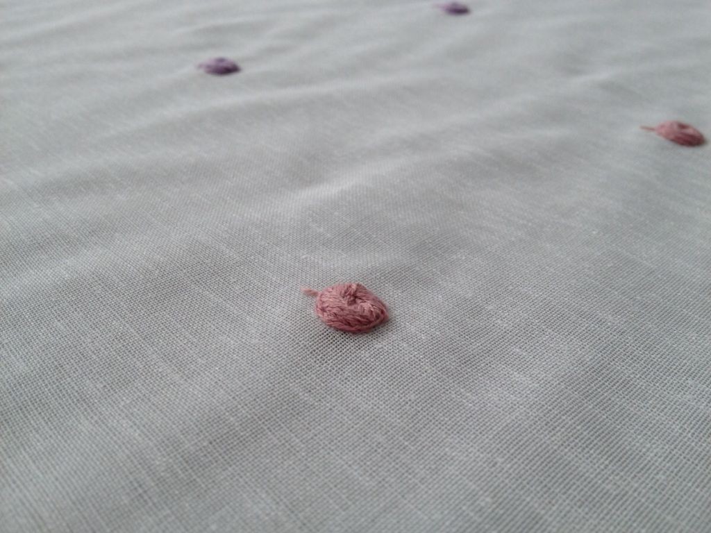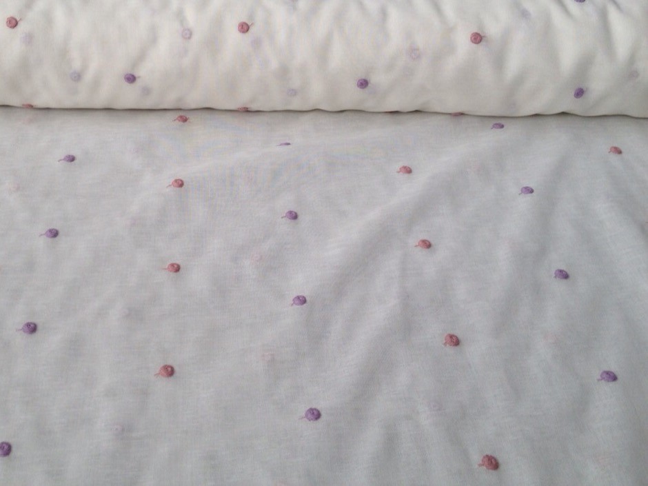 – Variante 1: Sfondo bianco con pois lilla e rosa.