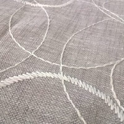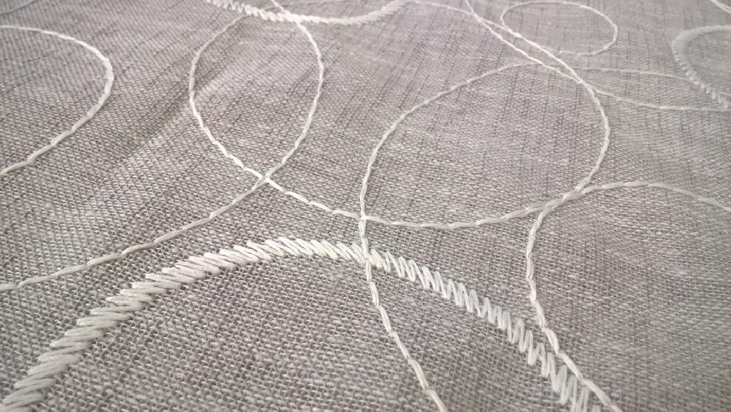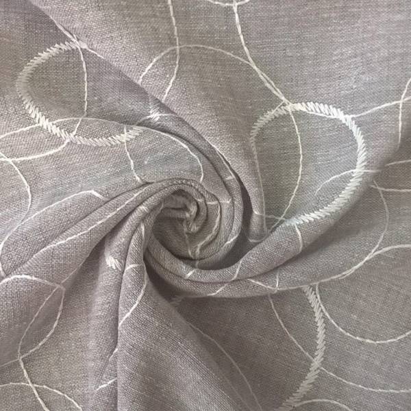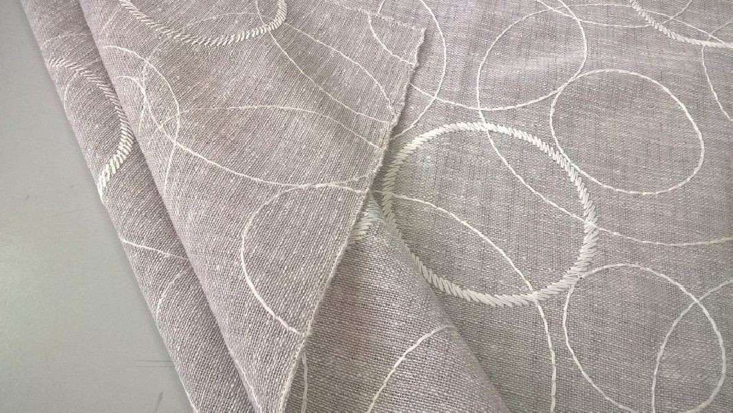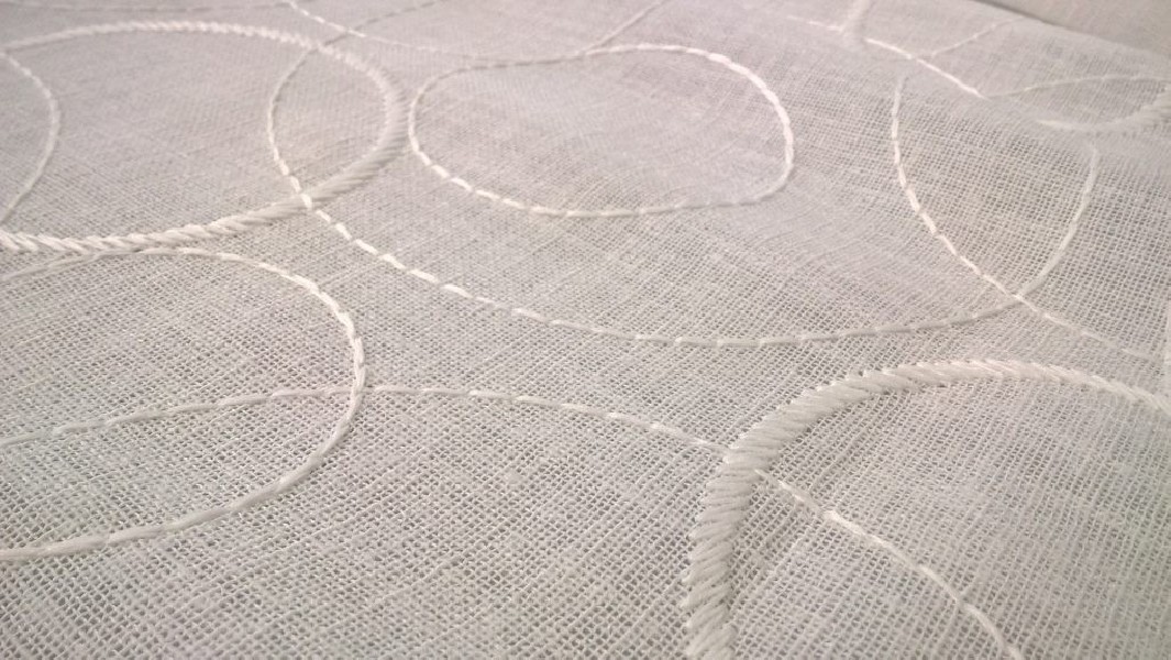 Tessuto per tendaggi con fantasia a cerchi bianchi di diverse dimensioni, cuciti a ricamo.