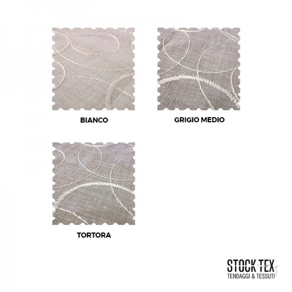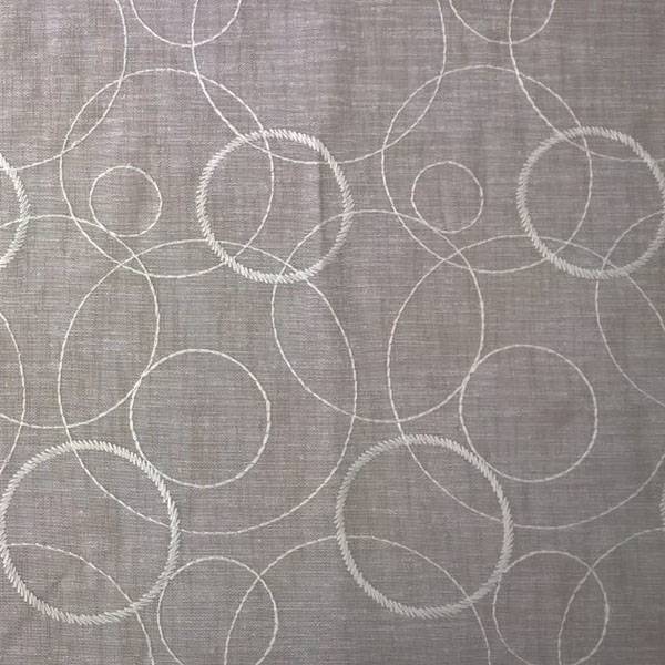 Tessuto per tende con fantasia a cerchi bianchi di diverse dimensioni, cuciti a ricamo