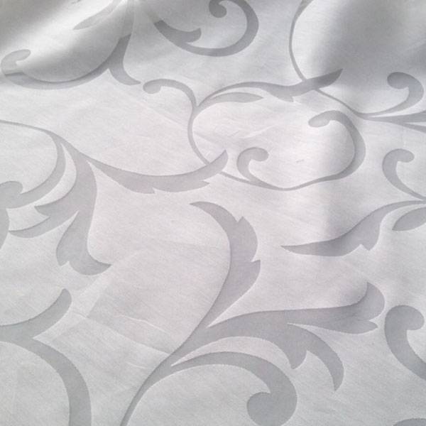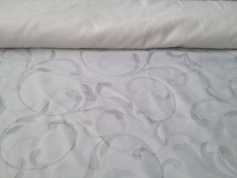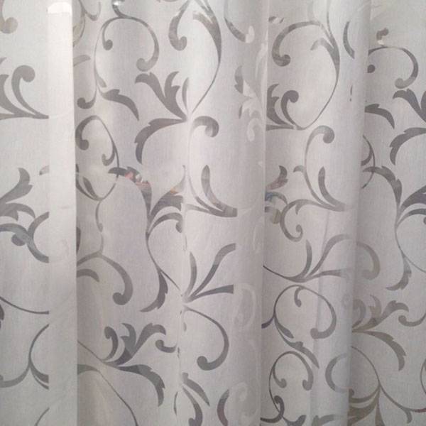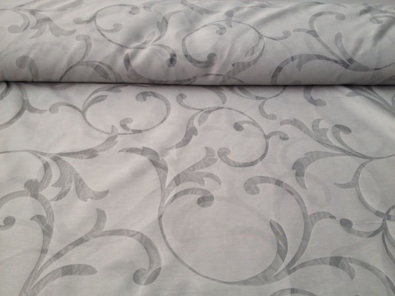 Tessuto per tendaggi a fantasia floreale damascata trasparente su sfondo semitrasparente.