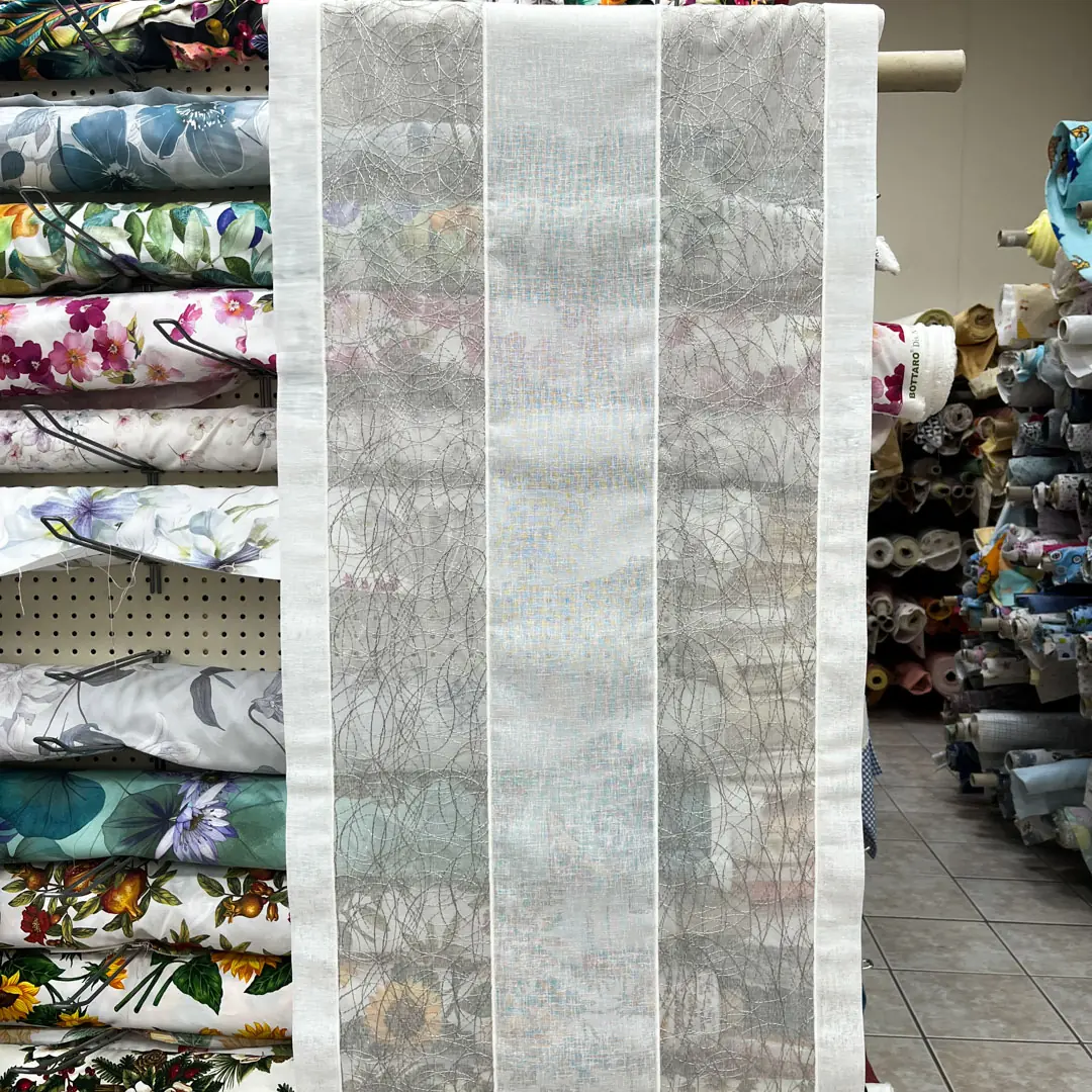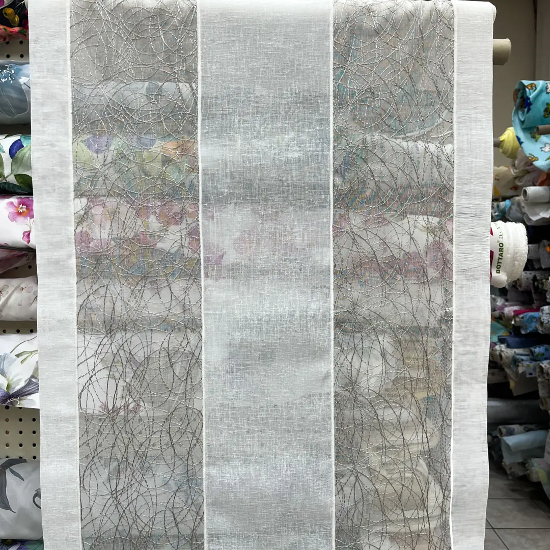 Scopri l’eleganza senza tempo di un tessuto per tende a vetro che unisce il fascino del lino con dettagli sofisticati in organza ricamata. La base, caratterizzata da un effetto lino raffinato e leggermente strutturato, dona una luminosità pura e genuina ad ogni ambiente. Gli inserti in organza, trasparenti e delicatamente impreziositi da ricami metallici che tracciano motivi curvilinei e intrecciati, creano un contrasto armonioso: un gioco di trasparenze e riflessi che esalta la luce naturale filtrata dal vetro.