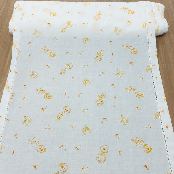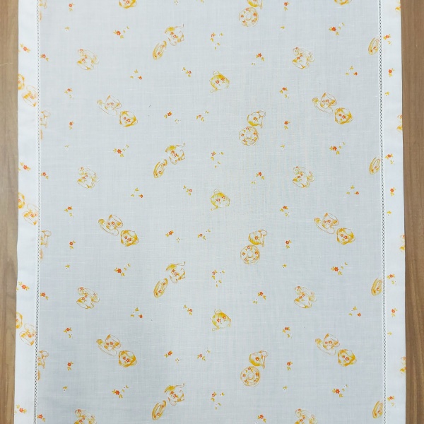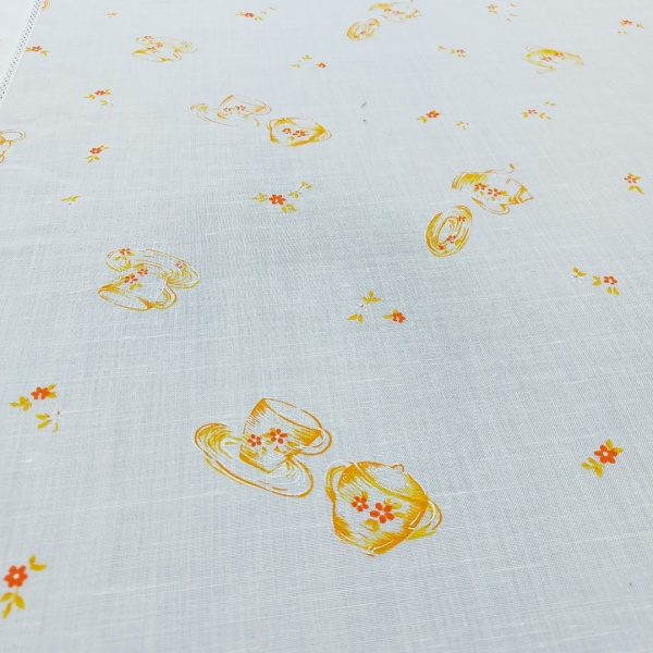 Dotata di orli laterali di 5 cm, fantasia con tazzine e teiere arancioni e gialle
