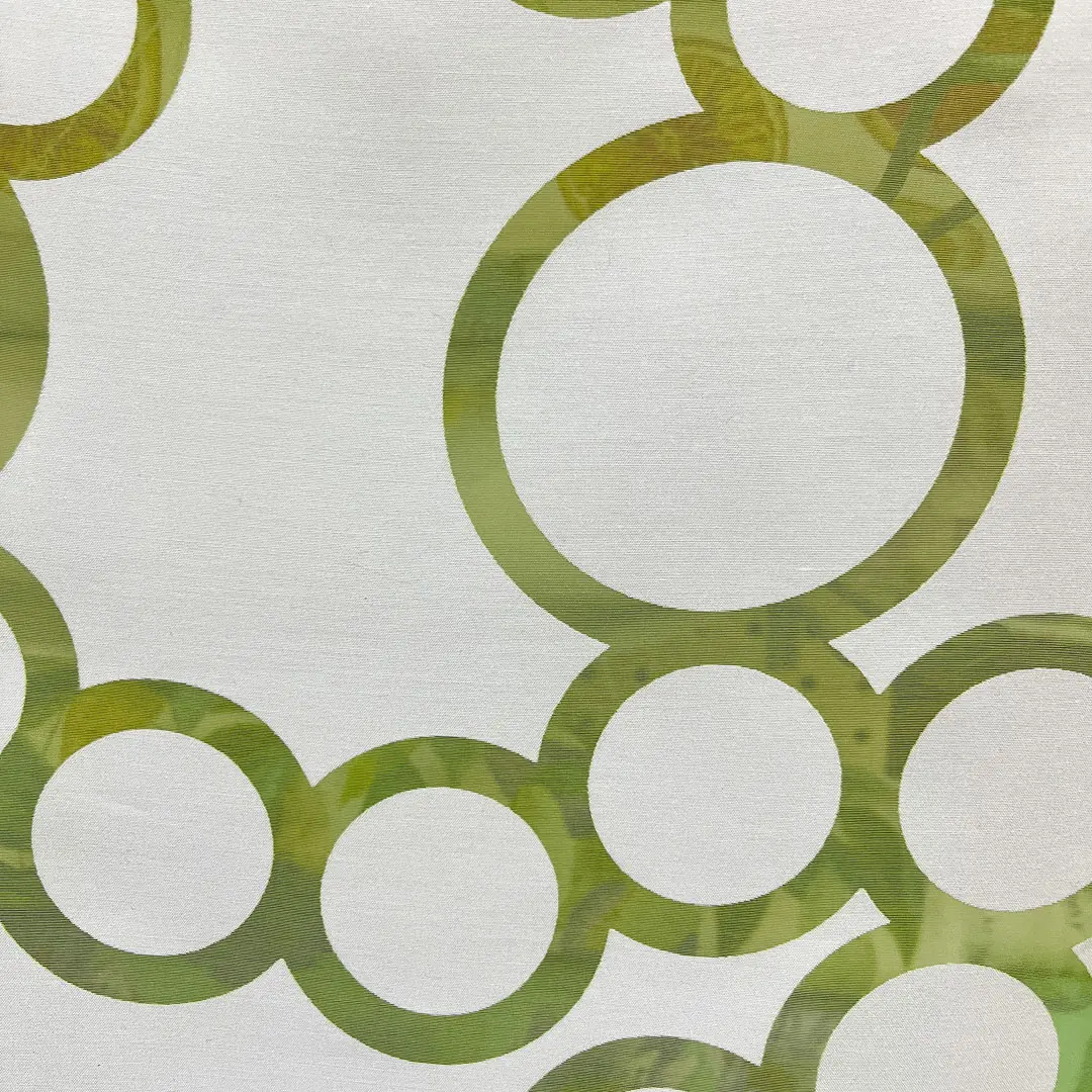 Tendina a vetro cerchi verde salvia in base bianca, una soluzione fresca e moderna per arredare la finestra con un tocco geometrico elegante. Il disegno a cerchi di diverse dimensioni crea movimento e leggerezza, perfetto per ambienti contemporanei e cucine luminose.