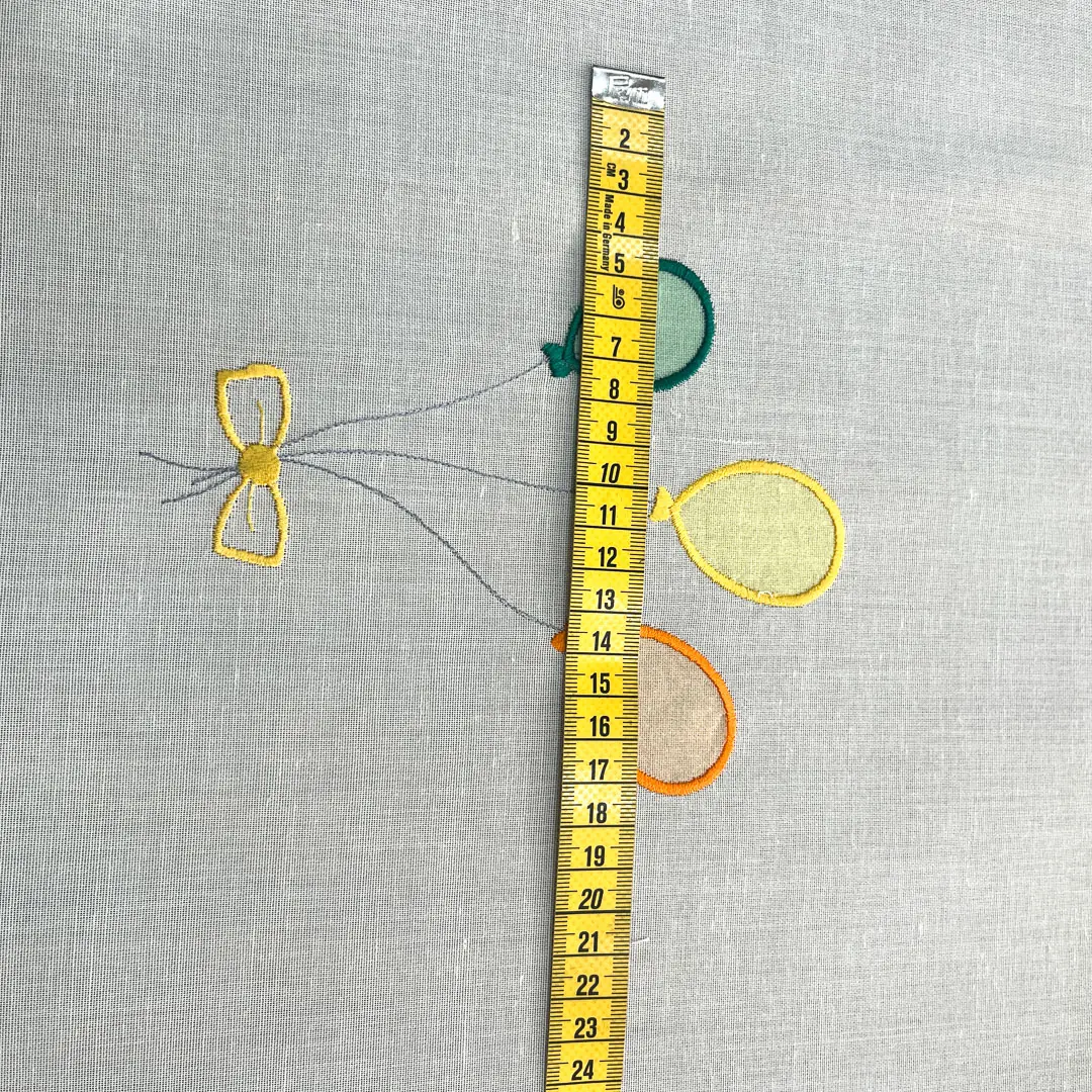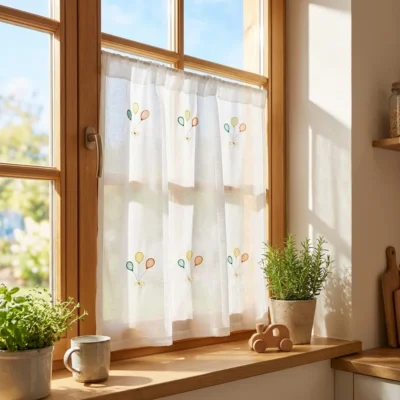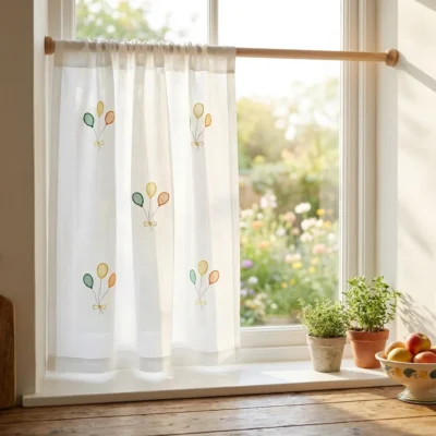 Tendina a vetro con palloncini ricamati, perfetta per dare un tocco allegro e giocoso alla finestra. La base bianca effetto lino è decorata da piccoli ma vivaci bouquet di palloncini ricamati nei toni del verde, giallo e arancio, distribuiti lungo l’altezza della tenda. Il risultato è una tenda luminosa e simpatica, ideale per camerette, cucine moderne o ambienti in cui vuoi portare un po’ di colore.