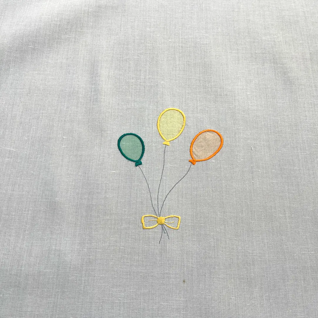 Base bianca effetto lino con palloncini ricamati multicolore (verde, giallo, arancio)