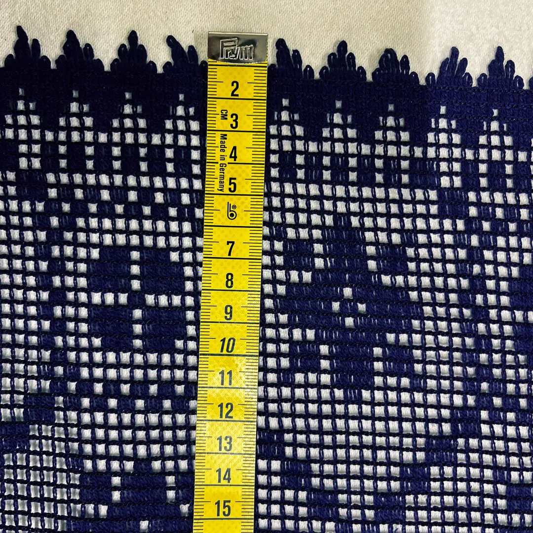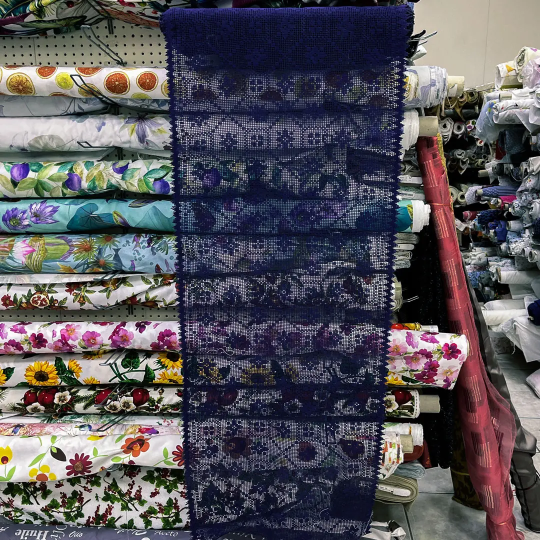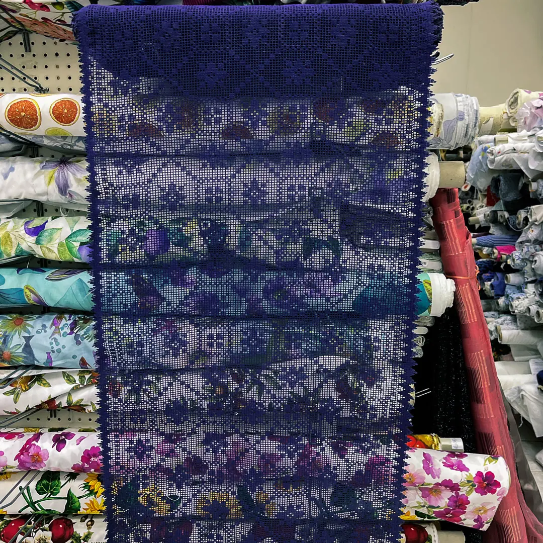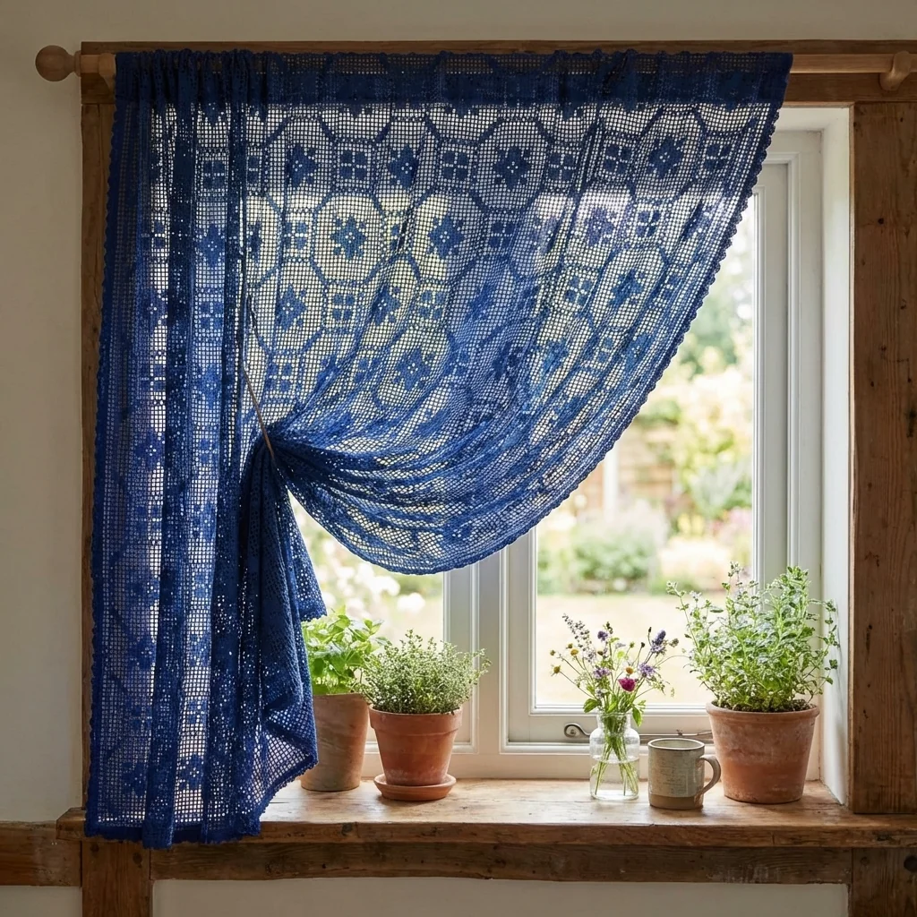 Questa tendina in pizzo macramè blu navy (blu notte) è perfetta per chi vuole vestire la finestra con un’eleganza artigianale ma facile da gestire ogni giorno. La lavorazione a rete presenta un ricco motivo geometrico floreale, con piccoli elementi a stella/fiore stilizzati e un raffinato bordino smerlato sul fondo, che aggiunge un dettaglio decorativo molto curato.