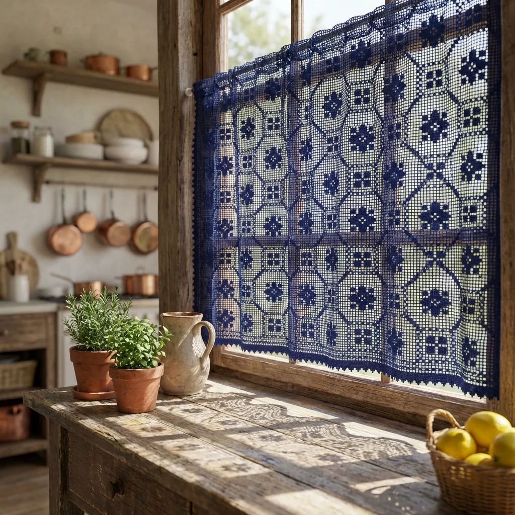La larghezza fissa di 60 cm la rende ideale come tendina a vetro singola o da abbinare in coppia sulle finestre più ampie. Il colore blu notte valorizza cucine in muratura, soggiorni rustici, taverne, bagni, case al mare e ambienti country chic, ma si integra bene anche in contesti più moderni che cercano un tocco romantico e personale.
